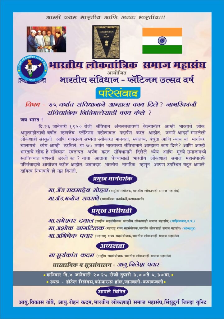 संविधान प्लॅटिनम उत्सव वर्षानिमित्त भारतीय लोकतांत्रिक समाज महासंघाकडून 4 जानेवारी रोजी परिसंवाद