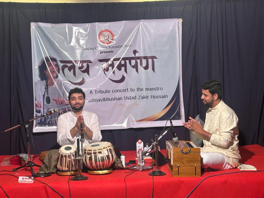 कणकवली (प्रतिनिधी) : जगद्विख्यात तबलावादक पद्मविभूषण उस्ताद झाकीर हुसेन यांना सांगीतिक मानवंदना म्हणून षड्ज ग्राम फाउंडेशन प्रस्तुत ‘लय समर्पण’ हा शास्त्रीय गायन – वादनाचा कार्यक्रम 18 जानेवारी रोजी श्री दत्तक्षेत्र, आशिये, कणकवली येथे संपन्न झाला. सुरुवातीला उस्तादजींच्या प्रतिमेला पुष्पहार अर्पण करून आणि दीपप्रज्वलनाने या कार्यक्रमाची सुरुवात झाली. युवा गायक हर्ष नकाशे यांनी मधुवंती हा राग सादर केला. संवादिनीवर साथसंगत निनाद जोशी आणि तबल्यावर वेदांत कुयेस्कर यांनी केली.