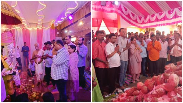चौके (अमोल गोसावी) : सिंधुदुर्ग जिल्ह्याचे माजी पालकमंत्री तथा पेंडूर गावचे सुपुत्र व विद्यमान आमदार आणि नवनिर्वाचित भाजपा महाराष्ट्र प्रदेश कार्यकारी अध्यक्ष आमदार रवींद्र चव्हाण यांनी आज दुपारी सपत्नीक पेंडूर येथे सुरू असलेल्या त्रैवार्षिक मांड उत्सवास हजेरी लावली. श्री देव वेताळ मंदिर येथे येत, श्री. देवी जुगाई श्री देव वेताळ चरणी नतमस्तक होत मनोभावे सेवा केली. यावेळी त्यांच्या पत्नी यांनी श्रीदेवी जुगाईची ओटी भरली तर आमदार रवींद्र चव्हाण यांनी श्रीदेव वेताळ चरणी श्रीफळ आणि भेट अर्पण केली. यानंतर श्रीदेवी सातेरी मंदिरात जात आमदार रवींद्र चव्हाण यांनी देवी सातेरीचे दर्शन घेतले. यावेळी त्यांच्या पत्नीने देवी सातेरीची खणा नारळाने ओटी भरली आणि देवीचरणी मनोभावे सेवा अर्पण केली.