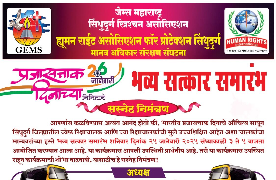 तळेरे (प्रतिनिधी) : जेम्स महाराष्ट्र, सिंधुदुर्ग ख्रिश्चन शांतता समिती, मानव अधिकार संरक्षण संघटना, कोकण विभाग रिक्षा टॅक्सी महासंघ व सिंधुदुर्ग जिल्हा ह्युमन राईट असोसिएशन फॉर प्रोटेक्शन यांच्या संयुक्त विद्यमाने सिंधुदुर्ग जिल्ह्यातील रिक्षाचालक- मालकांची जी मुले इंजिनिअर, नेव्ही, सैनिक, डॉक्टर, वकील, सीए किंवा उच्चपदावर कार्यरत आहेत, त्यांचा सत्कार २५ जानेवारी रोजी दुपारी ३.०० वाजता कणकवली येथील गोपुरी आश्रम, पर्यटन निवास केंद्र वागदे येथे करण्यात येणार आहे.