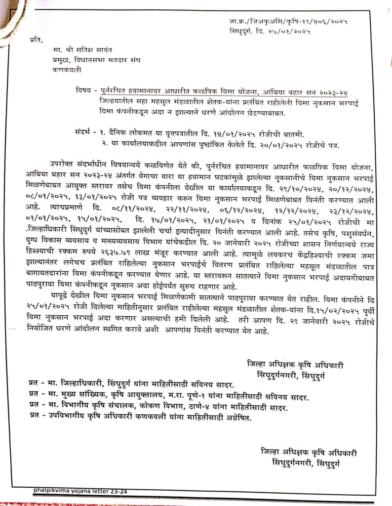 जिल्हा कृषी अधिक्षक यांनी दिलेल्या पत्रात कृषि, पशुसंवर्धन, दुग्ध विकास व्यवसाय व मत्स्यव्यवसाय विभाग यांचेकडील दि. २० जानेवारी २०२५ रोजीच्या शासन निर्णयान्वये राज्य हिश्श्याची रक्कम रुपये २६३७.७९ लाख मंजूर करण्यात आली आहे. त्यामुळे लवकरच केंद्र हिश्याची रक्कम जमा झाल्यानंतर लगेचच प्रलंबित राहिलेल्या नुकसान भरपाईचे वितरण प्रलंबित राहिलेल्या महसूल मंडळातील पात्र बागायतदारांना विमा कंपनीकडून करण्यात येणार आहे. विमा कंपनीकडून नुकसान भरपाई अदा होईपर्यंत आपल्या स्तरावरून पाठपुरावा सुरुच राहणार आहे. विमा कंपनीने दि २५/०१/२०२५ रोजी दिलेल्या माहितीनुसार प्रलंबित राहीलेल्या महसूल मंडळातील शेतकऱ्यांना दि.१५/०२/२०२५ पूर्वी विमा नुकसान भरपाई अदा करणार असल्याची हमी दिलेली आहे. तरी आपण दि. २९ जानेवारी २०२५ रोजीचे नियोजित धरणे आंदोलन स्थगित करावे असे पत्रात म्हटले आहे. १५ फेब्रुवारी पर्यंत विमा नुकसान भरपाई रक्कम शेतकऱ्यांना प्राप्त न झाल्यास कोणतीही पूर्व कल्पना न देता जिल्हाधिकारी कार्यालयासमोर आंदोलन छेडण्यात येणार असल्याचे यावेळी सतीश सावंत यांनी सांगितले.