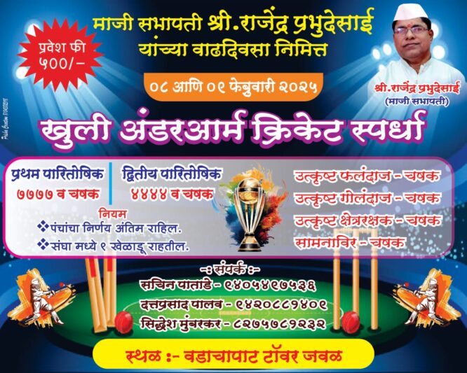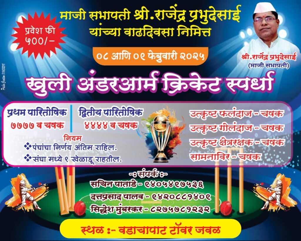 ०८ आणि ०९ फेब्रुवारी रोजी खुली अंडरआर्म क्रिकेट स्पर्धा आयोजित करण्यात आली आहे. प्रथम पारितोषिक ७७७७ व चषक, द्वितीय पारितोषिक ४४४४ व चषक. तसेच उत्कृष्ट फलंदाज – चषक, उत्कृष्ट गोलंदाज – चषक, उत्कृष्ट क्षेत्ररक्षक – चषक, सामनाविर – चषक अशी पारितोषिके देण्यात येणार आहेत. स्पर्धक संघांनी सचिन पाताडे – ९४०५४९७५३६, दत्तप्रसाद पालव ९४२०८८१४०९, सिद्धेश मुंबरकर ८२७५७८१२३२येथे संपर्क साधावा.