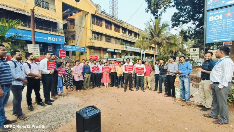 कणकवली (प्रतिनिधी) : राष्ट्रीय बॅंकांमध्ये नोकर भरती करणे, पाच दिवसांचा आठवडा करणे यासह अन्य मागण्यांसाठी युनायटेड फोरम ऑफ बँक युनियनच्यावतीने कुडाळ येथे निदर्शने केली. युनियनचे पदाधिकारी निखिल साटम, राजरूप केळुस्कर, हृषिकेश गावडे यांच्यासह बँक ऑफ इंडिया, बँक ऑफ महाराष्ट्र, युनियन बँक, बँक ऑफ बडोदा यांचे अधिकारी व कर्मचारी सहभागी झाले होते. बॅंक कर्मचारी व अधिकारी संघटनेने आपल्या विविध मागण्यांसाठी 24 ते 25 मार्च या कालावधीत दोन दिवसीय देशव्यापी संपाची घोषणा केली आहे. या पार्श्वभूमीवर युनायटेड फोरम ऑफ बँक युनियनच्यावतीने प्रत्येक जिल्ह्यात निदर्शने केली जात आहेत.