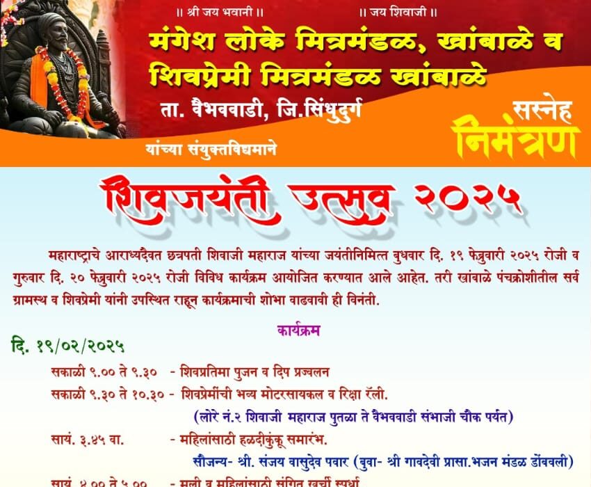 वैभववाडी (प्रतिनिधी) : मंगेश लोके मित्र मंडळ खंबाळे व शिवप्रेमी मित्र मंडळ खंबाळे वैभववाडी यांच्या संयुक्त विद्यमाने महाराष्ट्राचे आराध्य दैवत छत्रपती शिवाजी महाराज यांच्या जयंती निमित्त बुधवारी दिनांक १९ फेब्रुवारी २०२५ रोजी व गुरुवार दिनांक २० फेब्रुवारी २०२५ रोजी विविध कार्यक्रमांचे आयोजन करण्यात आले आहे. १९ फेब्रुवारी रोजी सकाळी ९ वाजता शिवप्रतिमा पूजन व दीप प्रज्वलन, लोरे नं. २ शिवाजी महाराज पुतळा ते वैभववाडी संभाजी चौक पर्यंत ९.३० वाजता शिवप्रेमी भव्य मोटरसायकल व रिक्षा रॅली, सायंकाळी ३.४५ वाजता संजय वासुदेव पवार यांच्या सौजन्याने महिलांसाठी हळदीकुंकवाचा समारंभ तसेच सायंकाळी ४ वाजता मुली व महिलांसाठी संगीत खुर्ची स्पर्धेचे आयोजन करण्यात आले आहे