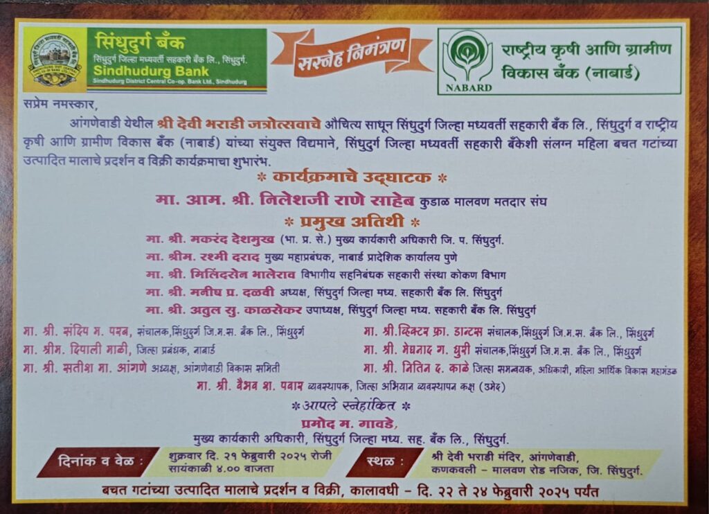 या शुभारंभ सोहळ्यास मोठ्या संख्येने आंगणेवाडी व देउळवाडा गावच्या ग्रामस्थांनी तसेच यात्रेस आलेल्या भाविकांनी व जिल्हा बँकेचे तालुक्यातील विकास अधिकारी,कर्मचारी यांनी सोहळ्यास उपस्थित रहावे असे आवाहन बँकेच्यावतीने करण्यात आले आहे. सदर बचत गटांच्या उत्पादित मालाचे प्रदर्शन व विक्री दि.२१फेब्रु.ते दि.२४फेब्रु. २०२५ पर्यंत सुरू राहणार आहे.