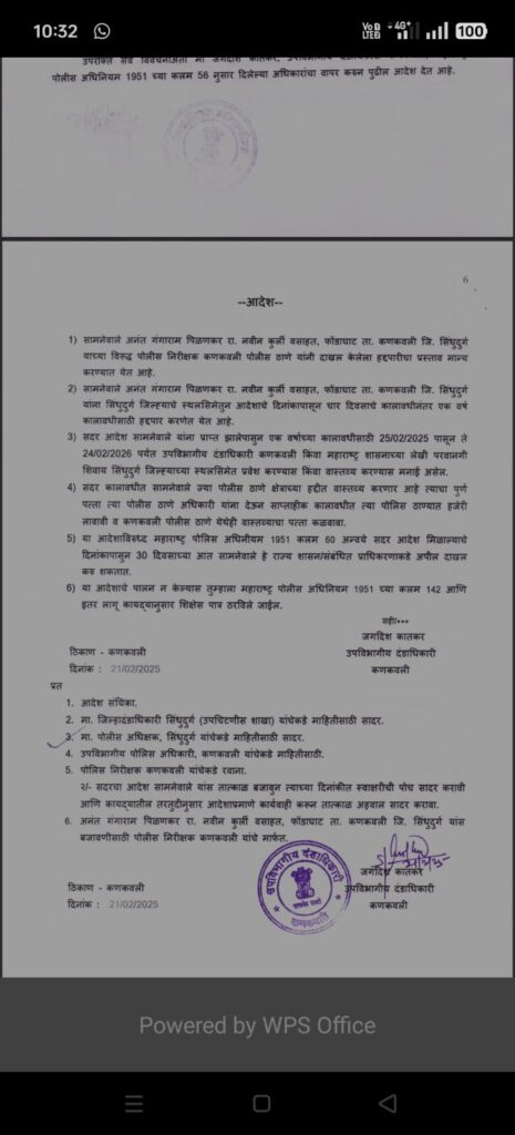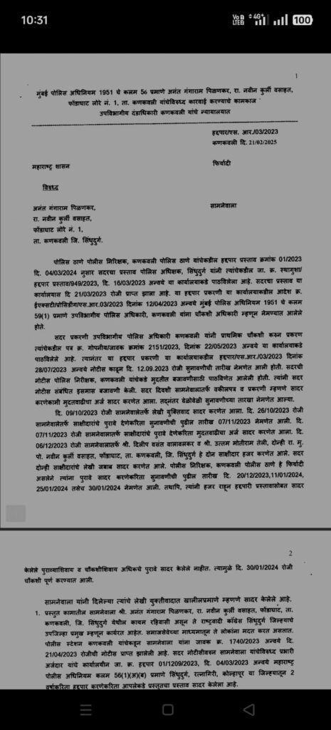 नवीन कुर्ली वसाहत, फोंडाघाट येथे वास्तव्यास असलेले अनंत गंगाराम पिळणकर व देवेंद्र अनिल पिळणकर याच्या विरूद्ध पोलीस निरीक्षक कणकवली पोलीस ठाणे यांनी दाखल केलेला हद्दपारीचा प्रस्ताव मान्य करण्यात येत आहे.तसेच सिंधुदुर्ग जिल्ह्याचे स्थलसिमेतुन आदेशाचे दिनांकापासून चार दिवसाच्या कालावधीनंतर एक वर्ष कालावधीसाठी हद्दपार करणेत येत असल्याचे स्पष्ट करण्यात आले असून सदर आदेश यांना प्राप्त झालेपासुन एक वर्षाच्या कालावधीसाठी 25/02/2025 पासून ते 24/02/2026 पर्यंत उपविभागीय दंडाधिकारी कणकवली किंवा महाराष्ट्र शासनाच्या लेखी परवानगी शिवाय सिंधुदुर्ग जिल्ह्याच्या स्थलसिमेत प्रवेश करण्यास किंवा वास्तव्य करण्यास मनाई असणार आहे.