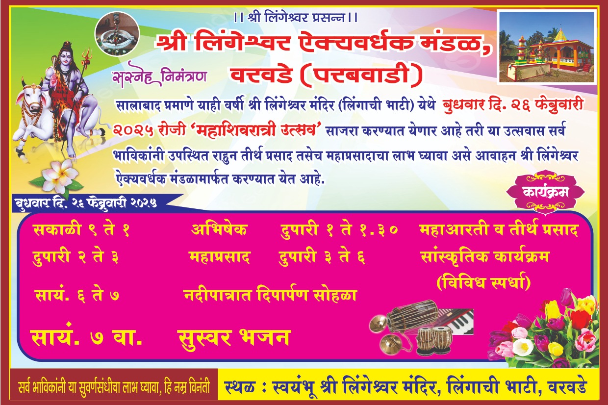 कणकवली (प्रतिनिधी) : श्री लिंगेश्वर ऐक्यवर्धक मंडळ, वरवडे (परबवाडी) सालाबाद प्रमाणे याही वर्षी श्री लिंगेश्वर मंदिर (लिंगाची भाटी) येथे बुधवार दि. २६ फेब्रुवारी २०२५ रोजी ‘महाशिवरात्री उत्सव’ साजरा करण्यात येणार आहे तरी या उत्सवास सर्व भाविकांनी उपस्थित राहुन तीर्थ प्रसाद तसेच महाप्रसादाचा लाभ घ्यावा असे आवाहन श्री लिंगेश्वर ऐक्यवर्धक मंडळामार्फत करण्यात येत आहे. कार्यक्रम – सकाळी ९ ते १ – अभिषेक, दुपारी १ ते १.३० – महाआरती व तीर्थ प्रसाद, दुपारी २ ते ३ – महाप्रसाद, दुपारी ३ ते ६ – सांस्कृतिक कार्यक्रम (विविध स्पर्धा), सायं. ६ ते ७ – नदीपात्रात दिपार्पण सोहळा, सायं. ७ वा. – सुस्वर भजन. सर्व भाविकांनी या सुवर्णसंधीचा लाभ घ्यावा, हि नम्र विनंती,