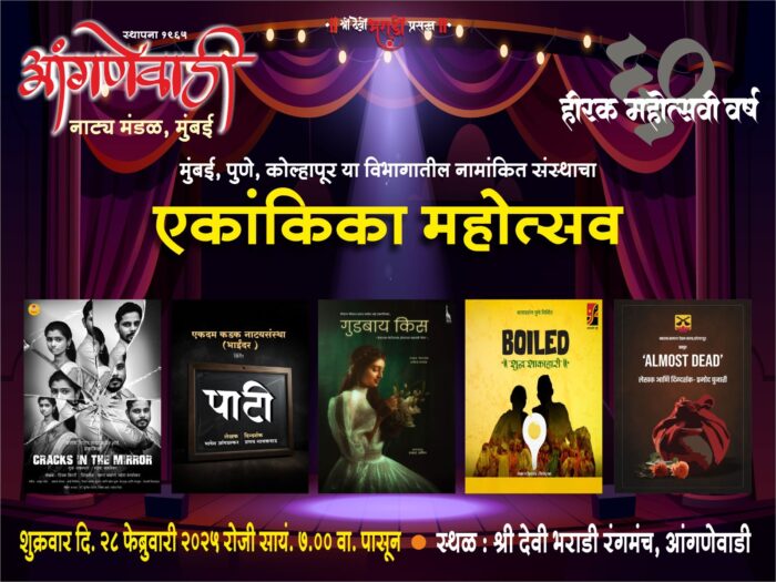 मसूरे (प्रतिनिधी) : आंगणेवाडी नाट्य मंडळ मुंबई यांच्या हिरक महोत्सव निमित्त २८ फेब्रुवारी रोजी एकांकिका महोत्सवाचे आयोजन करण्यात आले आहे. सायंकाळी ७ वाजल्यापासून एकांकिका महोत्सव होणार आहे. यामध्ये कलांश थिएटर प्रस्तुत ‘क्रॅक्स इन थिएटर’, एकदम कडक नाट्यसंस्था भाईंदर प्रस्तुत ‘पाटी’, जिराफ थिएटर प्रस्तुत ‘गुडबाय किस’, कलादर्शन पुणे प्रस्तुत ‘बॉईल्ड शुद्ध शाकाहारी’, गायन समाज देवल क्लब कोल्हापूर प्रस्तुत ‘ऑलमोस्ट डेड’ या एकांकिका सादर होणार आहेत. तरी नाट्यरसिकानी उपस्थित राहावे असे आवाहन आंगणे कुटुंबीय व आंगणेवाडी नाट्यमंडळ यांच्या वतीने करण्यात आले आहे.