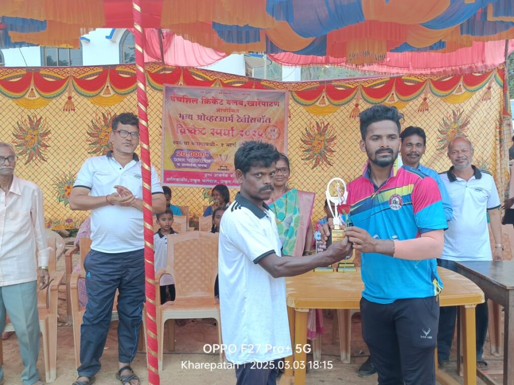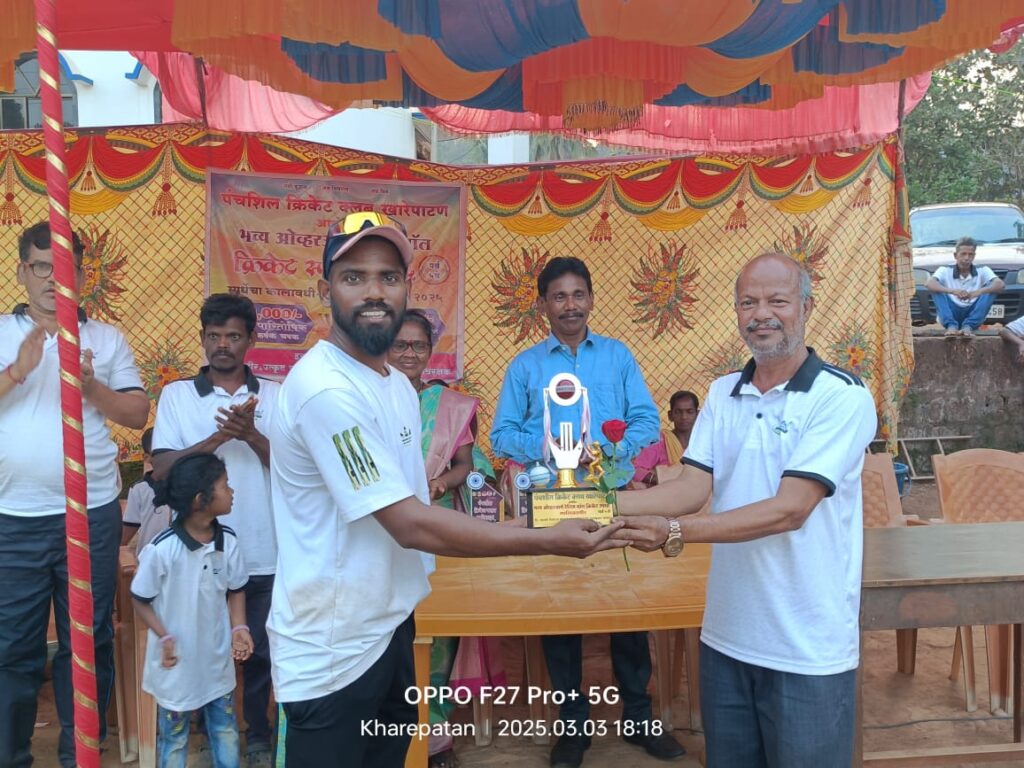 पंचशील क्रिकेट क्लब खारेपाटण च्या वतीने दि.१ मार्च ते ३ मार्च २०२५ या कालावधीत सलग तीन दिवस केदारेश्वर खारेपाटण च्या भव्य मैदानावर भरविण्यात आलेल्या या क्रिकेट स्पर्धेत कोकिसरे संघाचा खेळाडू प्रग्नेश याला धीरज जुमलेकर यांचे हस्ते उत्कृष्ट फलंदाज चशक देण्यात आला तर आर्या इलेव्हन कणकवली संघाचा खेळाडू अनिकेत याला संजय कदम यांचे हस्ते उत्कृष्ट गोलंदाज म्हणून चषक देण्यात आला.तसेच याच संघाचा खेळाडू सचिन याला उत्कृष्ट शेत्ररक्षक म्हणून श्री राहुल पाटणकर यांचे हस्ते चषक देण्यात आला. व याच संघाचा खेळाडू अनिकेत याला बक्षीस दाते धन्यकुमार कांबळे यांचे हस्ते मालिकावीर चषक देऊन गौरविण्यात आले.
