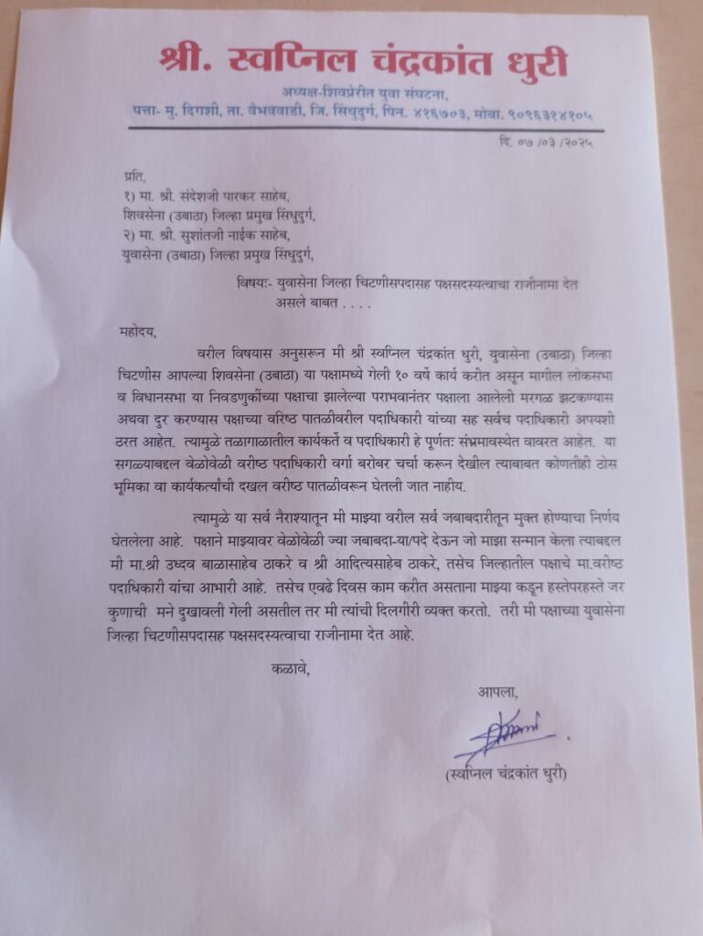 स्वप्नील धुरी हा उबाठा सेनेतील तरुण, अभ्यासू कार्यकर्ता म्हणून ओळखले जाते. त्यांनी लोकसभा व विधानसभा निवडणुकीत पक्षाचे प्रचार वक्ते म्हणून काम केले आहे. यापूर्वी सुद्धा त्यांनी आपल्या युवा सेना जिल्हा चिटणीस पदाचा राजीनामा दिला होता. त्यावेळी पक्ष नेतृत्वाने त्यांची समजूत काढली होती. मात्र आता मात्र त्यांनी आपल्या पदासह पक्ष सदस्यत्वाचा राजीनामा दिला आहे.