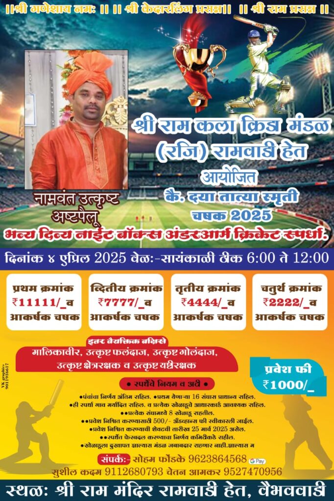 वैभववाडी (प्रतिनिधी) : दया तात्या स्मृती चषक 2025 आयोजित श्री राम कला क्रिडा मंडळ [रजि] रामवाडी हेत आयोजित भव्य दिव्य नाईट बॉक्स अंडरआर्म क्रिकेट स्पर्धेचे आयोजन दिनांक ४ एप्रिल २०२५ वेळ सायंकाळी ठीक ६:०० ते १२:००. स्थळ: श्री राम मंदिर रामवाडी हेत, वैभववाडी येथे करण्यात आले आहे इच्छुक असलेल्या सर्व क्रिकेट पटूंनी सहभाग घेण्यासाठी माहिती खालील प्रमाणे.