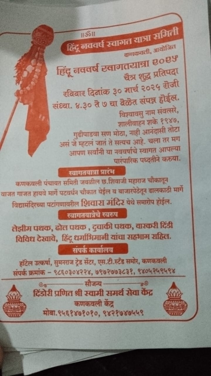 विश्वावसु नाम संवत्सरे, शालीवाहन शके १९४७, गुढीपाडवा सण मोठा, नाही आनंदासी तोटा असं जे म्हटलं जातं ते सत्यच आहे. आपण सर्वांनी या नववर्षाचे स्वागत आपल्या पारंपरिक पध्दतीने करुया.हिंदू नववर्ष स्वागत यात्रा समिती तर्फे आयोजित स्वागत यात्रा कणकवली पंचायत समिती जवळील छ. शिवाजी महाराज चौकातून वाजतगाजत हायवे मार्गे पटवर्धन चौकात येईल व बाजारपेठेतून ढालकाठी मार्गे विद्यामंदिरच्या पटांगणावरील शिवारा मंदिर येथे समारोप होईल.