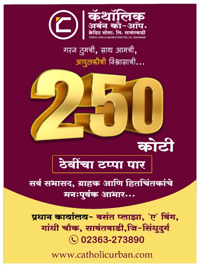 सावंतवाडी (प्रतिनिधी) : कॅथॉलिक अर्बन को. ऑप. क्रेडिट सोसा. लि. सावंतवाडी या संस्थेला ३१ मार्च २०२५ अखेर कोटी ३ लाख निव्वळ नफा झाला असून संस्थेने २५० कोटी ठेविचा टप्पा पार केला आहे. कॅथॉलिक पतसंस्थेने केवळ ३१ वर्षाच्या कार्यकाळात सर्व जनमानसात एक वेगळी प्रतिमा निर्माण केली आहे.