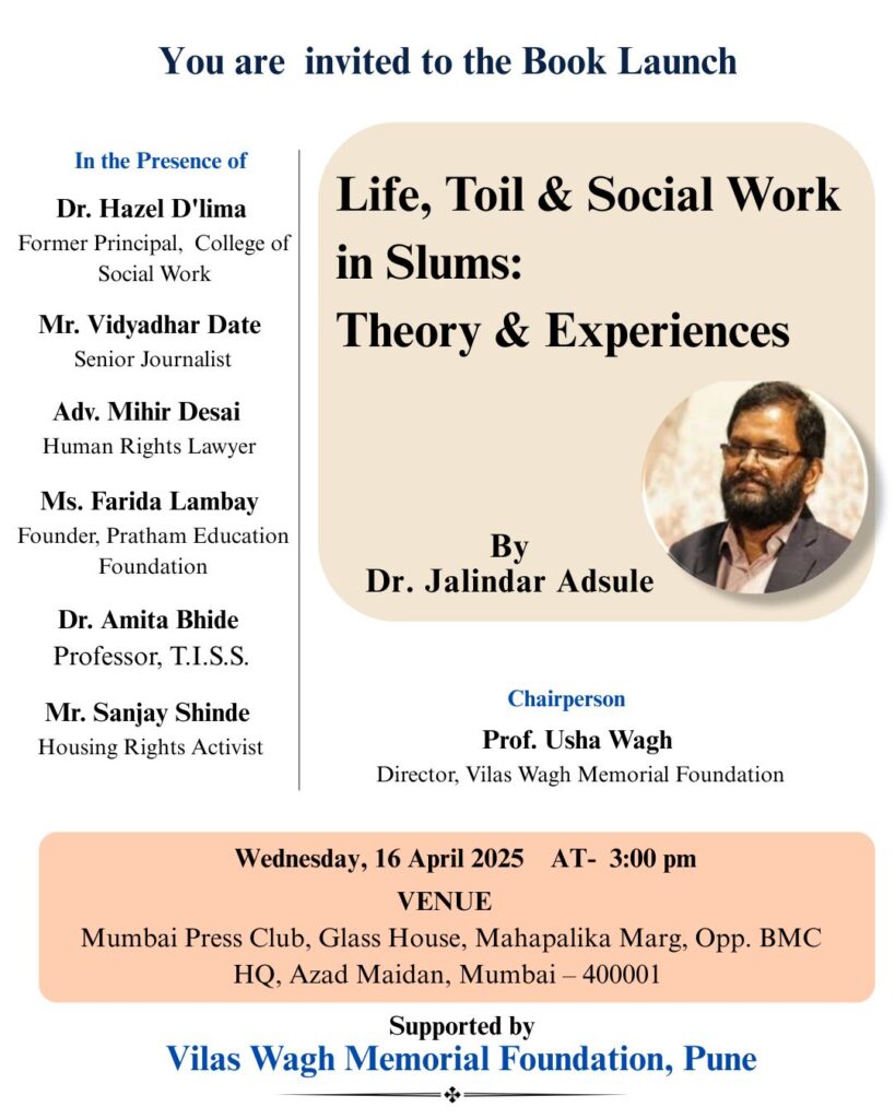 खारेपाटण (प्रतिनिधी) : समता शिक्षण संस्थेचे सचिव व सेवानिवृत्त प्राचार्य डॉ.जालिंदर अडसुळे यांनी त्यांचे समाज कार्य अध्यापन आणि झोपडपट्टयानतील कम्युनिटी ऑरग्नायजिन्ग ( समुदाय संघटन ) च्या अनुभवांवर आधारित लिहिलेल्या ‘लाईफ , टॉईल अँड सोशल वर्क इन स्लम्सः थिअरी अँड एक्स्पिरियन्स..या पुस्तकाचे प्रकाशन दि.१६ एप्रिल २०२५ रोजी मुंबई येथे महापालिका मुख्यालयासमोर मुंबई प्रेस क्लब मध्ये होणार आहे.