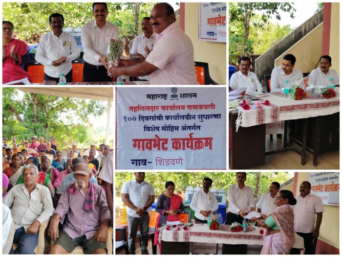 कणकवली (प्रतिनिधी) : तहसीलदार कार्यालय, कणकवली यांच्या वतीने १०० दिवसांच्या कार्यालयीन सुधारणा विशेष मोहिमेअंतर्गत शिडवणे ग्रामपंचायतीमध्ये गावभेट कार्यक्रम नुकताच संपन्न झाला. या कार्यक्रमात कणकवलीचे तहसीलदार दीक्षांत देशपांडे यांच्यासह पाटील आणि मंडळ अधिकारी बावलेकर यांनी उपस्थिती दर्शविली. शिडवणेचे सरपंच रविंद्र शेट्ये आणि माजी वित्त व बांधकाम सभापती रविंद्र जठार यांनी पुष्पगुच्छ देऊन त्यांचे स्वागत केले. मंडळ अधिकारी बावलेकर यांनी कार्यक्रमाच्या आयोजनामागचा उद्देश स्पष्ट केला.