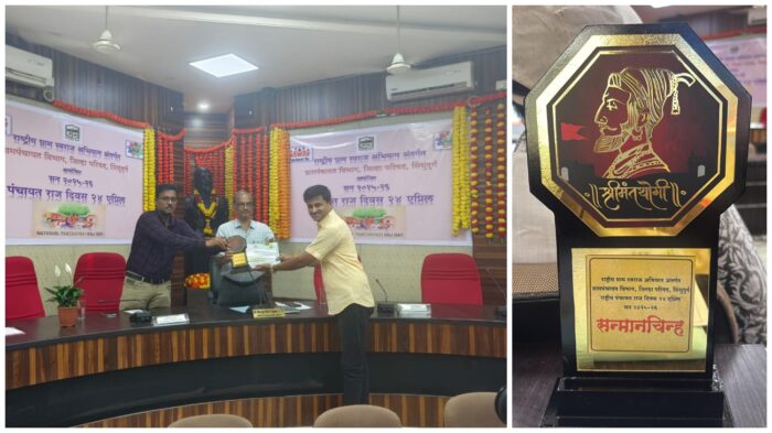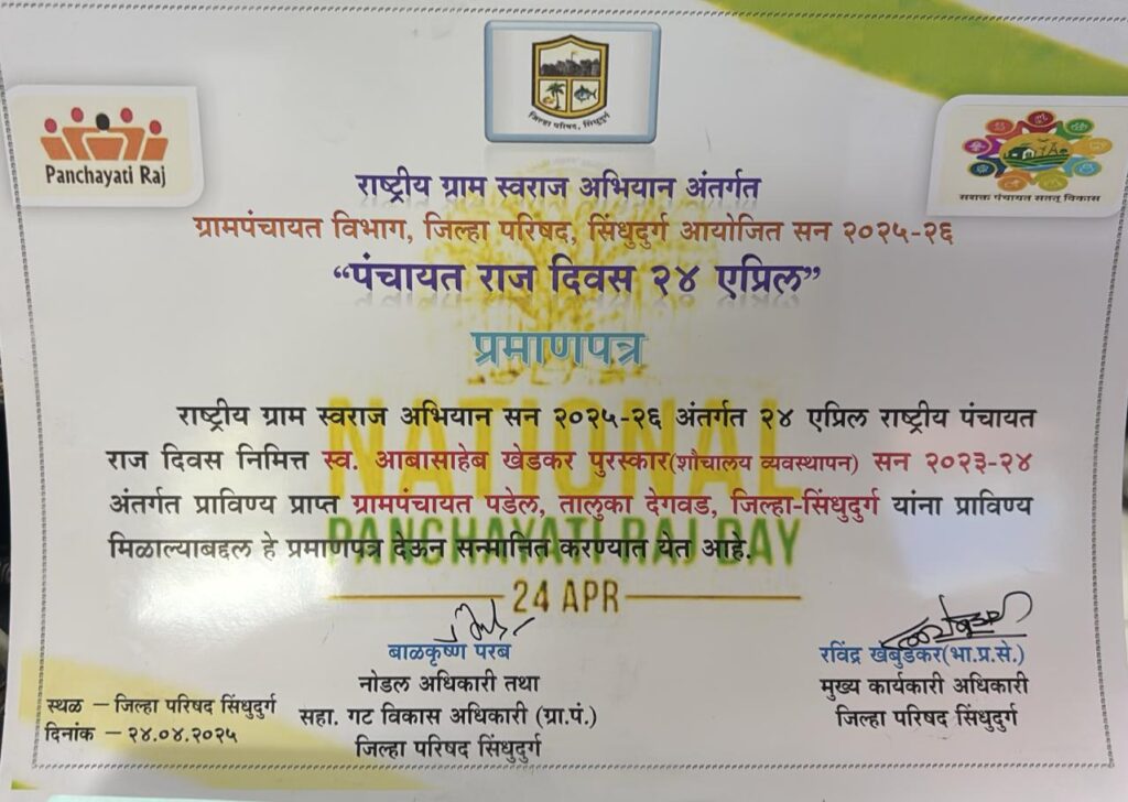 देवगड (प्रतिनिधी) : सिंधुदुर्ग जिल्हा परिषदेचा सन २०२३- २४ चा स्वर्गीय आप्पासाहेब खेडकर जिल्हास्तरीय प्रथम पुरस्कार देवगड तालुक्यातील पडेल ग्रामपंचायत ला प्रदान करण्यात आला. पंचायत राज दिवसाच्या औचित्यावर २४ एप्रिल रोजी सिंधुदुर्ग जिल्हा परिषद चे मुख्य कार्यकारी अधिकारी रविंद्र खेबूडकर यांच्या हस्ते पडेल गावचे सरपंच भूषण पोकळे यांनी पुरस्कार स्वीकारला. यावेळी उपमुख्य कार्यकारी श्री.काळे उपस्थित होतें. हा पुरस्कार हा समस्त पडेल ग्रामस्थांचा आहे. पडेलवासियांनी घर तिथे शौचालय हे ग्रामपंचायती चे म्हणणे समजून घेत प्रतिसाद दिला. त्यामुळेच आज पडेल गावात प्रत्येक घरात शौचालय आहे. म्हणूनच जिल्हास्तरीय प्रथम क्रमांकाचा पुरस्कार पडेल ग्रामपंचायतीला मिळाल्याची प्रतिक्रिया सरपंच भूषण पोकळे यांनी दिली.