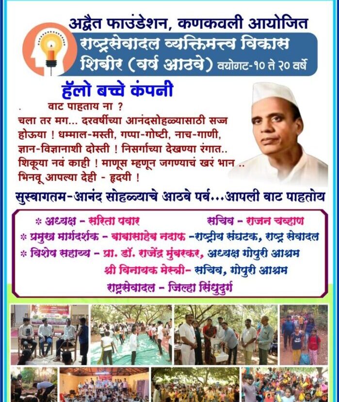 Home बातम्या राष्ट्र सेवा दल व्यक्तिमत्व विकास शिबिर ( निवासी ) राष्ट्र सेवा दल व्यक्तिमत्व विकास शिबिर ( निवासी )आपला सिंधुदुर्गMay 3, 2025बातम्या Views: 203 स्थळ – गोपुरी आश्रम वागदे कणकवली दि. 9 मे ते 13 मे संपर्क मोबा. 9403296694 /7038834356/ 9604655844 / 9404450056 Previous Post सावडाव विनयभंग गुन्ह्यात आरोपीचा जामीन न्यायालयाने फेटाळला Next Post चिंदर भटवाडी शाळेत श्रीमद भगवतगीता पठण कार्यक्रम!