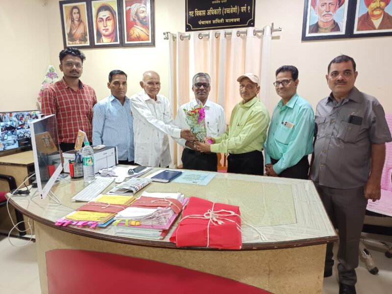 आचरा (प्रतिनिधी) : मालवण तालुक्यात नव्याने हजर झालेले गटविकास अधिकारी उच्चस्थर नं १ श्याम चव्हाण यांची सेवानिवृत्त ग्रामसेवक संवर्ग महासंघ तालुका शाखा मालवण यांच्या वतीने आज बुधवारी ७ मे रोजी मालवण येथे सेवा निवृत्त ग्रामसेवक महासंघाचे जिल्हा उपाध्यक्ष हनुमंत प्रभू व अशोक ओटवणेकर यांच्या वतीने पुष्पगुच्छ देऊन स्वागत करण्यांत आले. यावेळी विस्तार अधिकारी (ग्रा.प.) पी . डी.जाधव, विस्तार अधिकारी (कृषि) सुनील चव्हाण, व्ही. के. जाधव, गायकवाड आदी मान्यवर उपस्थित होते.