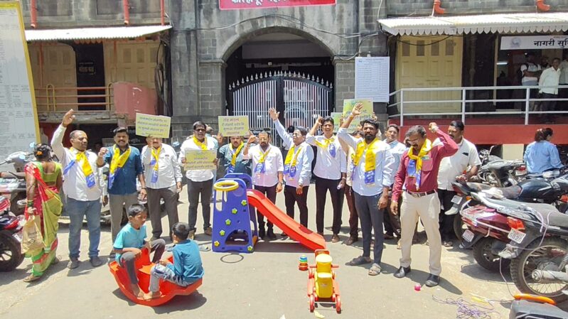 आंदोलनस्थळी घसरगुंडीवर खेळत लहान मुलांनी महापालिकेच्या कारभाराचे विडंबन समोर आणले.