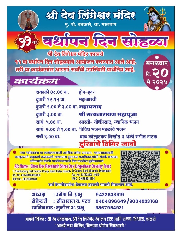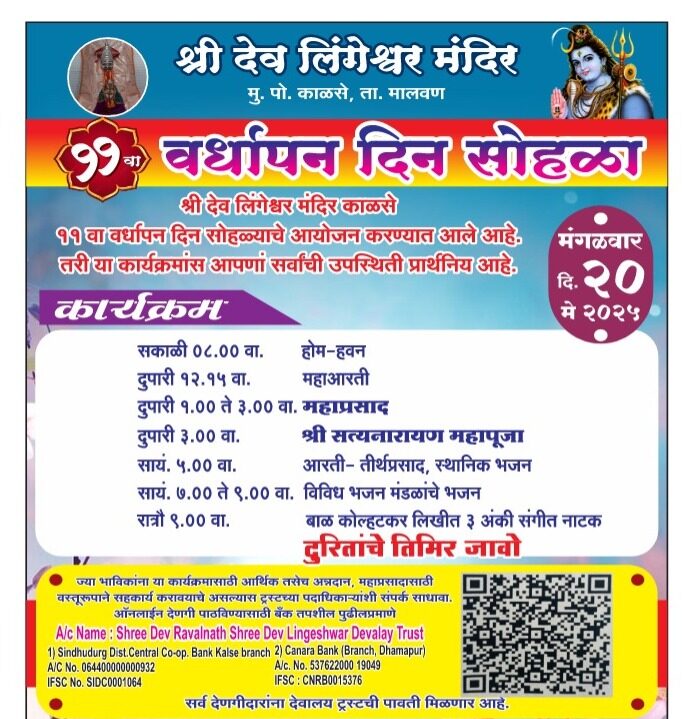 चौके (प्रतिनिधी) : काळसे येथील श्री देव लिंगेश्वर मंदिराच्या ११ व्या वर्धापन दिन सोहळ्याचे आयोजन मंगळवार दिनांक २० मे रोजी करण्यात आले आहे. या निमित्ताने सकाळी ८ वाजता होम हवन, दुपारी १२.१५ वाजता महाआरती, दुपारी १.०० ते ३.०० महाप्रसाद, दुपारी ३.०० वाजता श्री सत्यनारायण महापूजा, सायं. ५.०० वाजता आरती – तीर्थप्रसाद, स्थानिक भजन, सायं ७.०० ते ९.०० विविध भजन मंडळांची भजने, आणि रात्रौ ९.०० वाजता “दुरीतांचे तिमिर जावो” हे बाळ कोल्हटकर लिखित ३ अंकी संगीत नाटक आयोजित करण्यात आले आहे. तरी गावातील सर्व रहिवाशांनी आणि भाविकांनी मोठया संख्येने उपस्थित राहून सोहळ्याचा लाभ घ्यावा असे आवाहन श्री देव रवळनाथ, श्रीदेव लिंगेश्वर देवालय ट्रस्ट यांच्या वतीने करण्यात आले आहे.