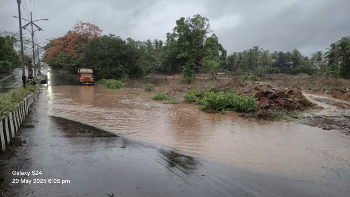 कणकवली (प्रतिनिधी) : मान्सूनपूर्व पावसाने सायंकाळच्या सुमारास कणकवली शहरात जोरदार धुमाकूळ घातला. ढगांच्या गडगडाटासह सुरू झालेल्या पावसाने आपले उग्र रुप दाखविले. आज दिवसभर वातावरण ढगाळ होते. त्यामुळे उष्णतेचे प्रमाणही वाढले होते. संध्याकाळच्या सुमारास सुरू झालेल्या पावसाने बाजारासाठी आलेल्या लोकांची धांदल उडविली. कणकवली शहरात तसेच परिसरात मंगळवारी सायंकाळी वादळी वार्यासह पावसाने झोडपून काढल्याने जनजीवन विस्कळीत झाले. कणकवली शहरात रस्त्यावर पाणीच पाणी झाले होते.