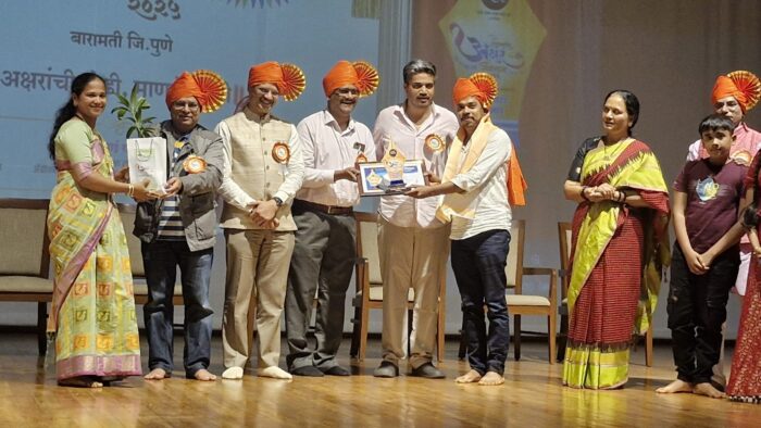 चौके (प्रतिनिधी) : बारामती (शारदानगर) पुणे येथे नुकतेच ४ थे राज्यस्तरीय ‘अक्षर संमेलन’ संपन्न झाले. ‘माझी शाळा माझा फळा समुह’ आणि ‘ॲग्रीकल्चरल डेव्हलपेंट ट्रस्ट’ (बारामती) यांच्यावतीने भरवण्यात आलेल्या या संमेलनातील ‘अक्षर सन्मान सोहळ्यात वराडकर हायस्कुल कट्टा व कनिष्ठ महाविद्यालय कट्टा चे कला शिक्षक प्रसिद्ध चित्रकार, रांगोळी कार समीर चांदरकर यांच्या कलाक्षेत्रातील योगदानाबद्दल त्यांना ‘राज्यस्तरीय अक्षर गौरव पुरस्काराने’ सन्मानित करण्यात आले.