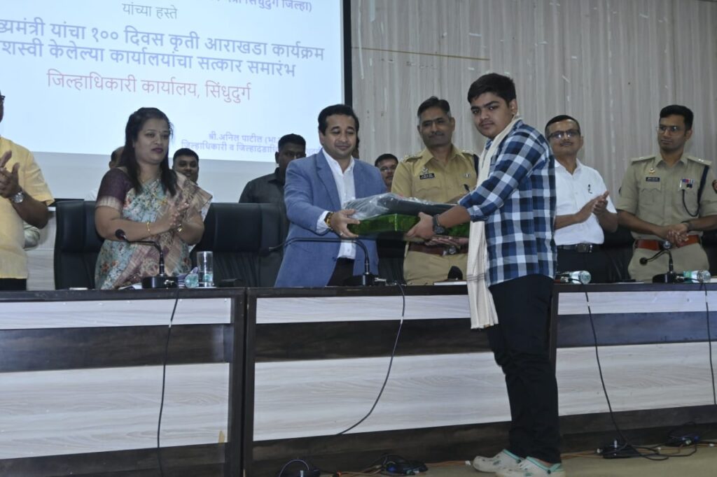 जिल्हा नियोजन समितीच्या नवीन सभागृहात शुक्रवारी दुपारी हा कार्यक्रम पालकमंत्री नितेश राणे यांच्या उपस्थितीत संपन्न झाला. यावेळी व्यासपीठावर अपर जिल्हाधिकारी शुभांगी साठे, जिल्हा पोलिस अधीक्षक डॉ मोहन दहिकर, प्रभारी मुख्य कार्यकारी अधिकारी डॉ माणिक दिवे, अपर पोलीस अधीक्षक कृषीकेश रावले, निवासी उपजिल्हाधिकारी मच्छिंद्र सुकटे, भाजप जिल्हाध्यक्ष प्रभाकर सावंत, जिल्हा बँक अध्यक्ष मनीष दळवी सामान्य प्रशासन उपजिल्हाधिकारी बालाजी शेवाळे, शिक्षणाधिकारी कविता शिंपी आदी उपस्थित होते. जिल्ह्यातील इयत्ता बारावीच्या विज्ञान, कला आणि वाणिज्य विद्याशाखा व इयत्ता दहावीच्या बोर्डाच्या परीक्षेत प्रथम तीन क्रमांक पटकाविलेल्या विद्यार्थ्यांचा सत्कार पालकमंत्री नितेश राणे यांच्याहस्ते शाल, पुष्पगुच्छ आणि लॅपटॉप देवून करण्यात आला.