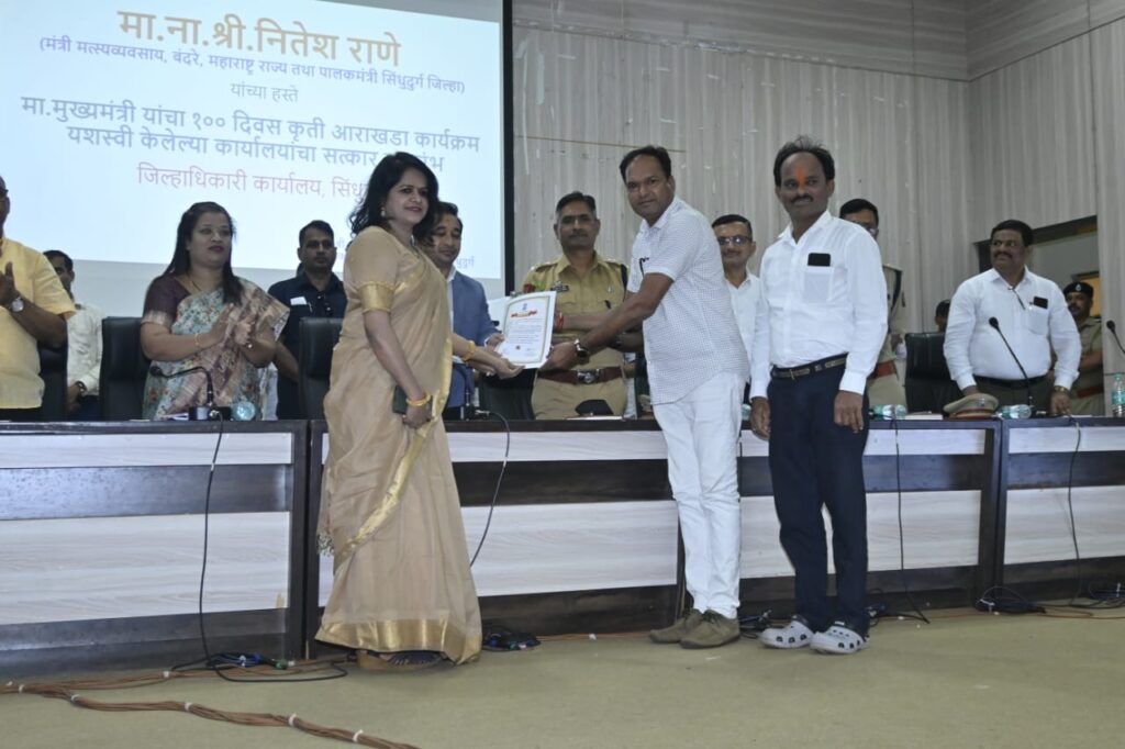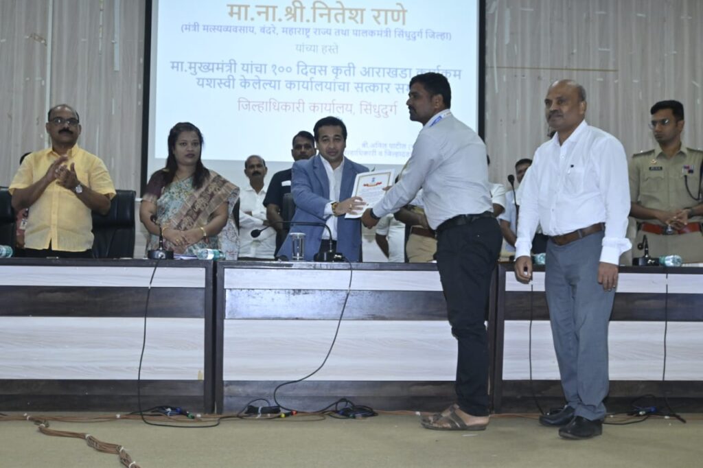 जिल्हा नियोजन समितीच्या नवीन सभागृहात मुख्यमंत्री देवेंद्र फडणवीस यांच्या संकल्पनेतून राबविण्यात आलेल्या शंभर दिवस कार्यक्रमांतर्गत उत्कृष्ट काम करीत कोकण विभागात प्रथम, द्वितीय आणि तृतीय आलेल्या विभागांच्या अधिकाऱ्यांचा सत्कार आयोजित करण्यात आला होता. हे सत्कार पालकमंत्री राणे यांच्याहस्ते प्रमाणपत्र देवून करण्यात आला. यावेळी व्यासपीठावर अपर जिल्हाधिकारी शुभांगी साठे, जिल्हा पोलिस अधीक्षक डॉ मोहन दहिकर, प्रभारी मुख्य कार्यकारी अधिकारी डॉ माणिक दिवे, अपर पोलीस अधीक्षक कृषीकेश रावले, निवासी उपजिल्हाधिकारी मच्छिंद्र सुकटे, भाजप जिल्हाध्यक्ष प्रभाकर सावंत, जिल्हा बँक अध्यक्ष मनीष दळवी सामान्य प्रशासन उपजिल्हाधिकारी बालाजी शेवाळे, जिल्हा आपत्ती व्यवस्थापन व्यवस्थापक राजश्री सामंत आदी उपस्थित होते.