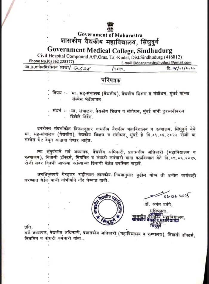 ओरोस (प्रतिनिधी) : शिवसेना उद्धव बाळासाहेब ठाकरे पक्षाच्या शिष्टमंडळाने सिंधुदुर्ग शासकीय वैद्यकीय महाविद्यालयात बुधवारी धडक देत कंत्राटी कमर्चाऱ्यांच्या पगाराच्या पैशात केला जाणारा भ्रष्टचार उघडकीस आणला होता. त्याचबरोबर २० जून पर्यंत आयुक्तांसोबत बैठक लावा अन्यथा २१ जून रोजी ठिय्या आंदोलन छेडू असा इशारा वैद्यकीय महाविद्यालयाचे अधिष्ठाता अनंत डवंगे यांना दिला होता याची दखल घेऊन वैद्यकीय शिक्षण व संशोधन मुंबईचे सहसंचालक हे ०९ जून २०२५ रोजी सिंधुदुर्ग शासकीय वैद्यकीय महाविद्यालयात भेट देऊन आढावा घेणार आहेत. याबाबतचे परिपत्रक अधिष्ठाता डॉ. अनंत डवंगे यांनी काढले आहे. सर्व अध्यापक, वैद्यकीय अधिकारी,प्रशासकीय अधिकारी (महाविद्यालय व रुग्णालय) निवासी डॉक्टर, नियमित व कंत्राटी कमर्चारी यांनी ०९ जून रोजी आपल्या कर्तव्याच्या ठिकाणी वेळेत उपस्थित रहावे. अनधिकृत पणे गैरहजर राहिल्यास शासकीय नियमानुसार कारवाई करण्यात येईल असे आदेश अधिष्ठाता डॉ. अनंत डवंगे यांनी परिपत्रकाद्वारे दिले आहेत.
