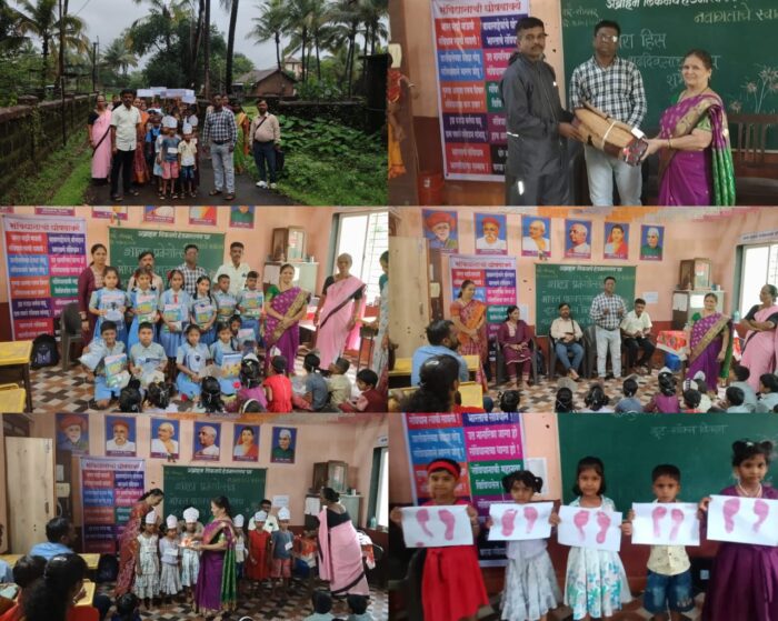 यावेळी तपासणीसाठी आलेले विशेष शिक्षक, नितेश तेली यांनी प्रशालेतील नियोजनाची प्रशंसा करताना मुलांचे स्वागत केले. मुलांच्या आदर्श भविष्यासाठी शाळेतील शिक्षक नेहमीच सर्वंकष प्रयत्न करतात.मात्र पालक आणि पाल्यांनी सुद्धा विशेष सजग राहून स्पर्धात्मक वाटचालीस सामोरे गेले पाहिजे. यावेळी शि.पा.संघाचे अध्यक्ष उमेश वंजारे यांनी शाळा आणि शिक्षक वर्गाचे कौतुक करून, शिक्षण – शिस्तही संस्काराचा खरा पाया सक्षम करणारी जि.प.ची प्राथमिक शाळा, नेहमीच आदर्शवत आहे. असा विश्वास व्यक्त केला. यावेळी मान्यवरांचे हस्ते मुलांना गणवेश, शूज, सॉक्स, आणि मोफत पाठ्यपुस्तकांचे वितरण करण्यात आले. वंजारे यांनी पावसाळा असल्याने शाळेला पायपुसणी भेट दिली. यावेळी मुख्याध्यापक माधवी जोशी, शितल बागवे, भाग्यश्री पाताडे, प्राची उरणकर,मयुरी मेस्त्री, सुलभा लाड,इत्यादी शिक्षक, कर्मचारी ,अंगणवाडी स्टाफ सह पालकांची उपस्थिती मोठ्या संख्येने होती. शेवटी मुख्याध्यापक माधवी जोशी यांनी आभार मानले…