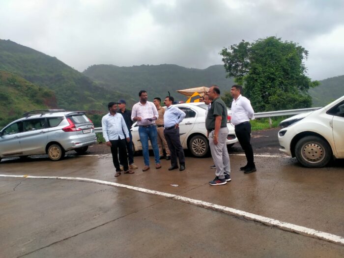 यावेळी त्यांच्यासमवेत प्रांताधिकारी जगदीश कातकर, तहसीलदार सूर्यकांत पाटील, राष्ट्रीय महामार्ग प्राधिकरचे पवन पाटील, सार्वजनिक बांधकामचे उपाभियंता जोशी, शुभम दूंडीये, तसेच एन डी. आर. फ ची टीमचे निरीक्षक श्री. यादव व १४ जवानांची टीम होती.चालू वर्षी संपूर्ण करूळ घाटाचे नूतनीकरण करण्यात आले आहे. नूतनीकरणानंतर हा पहिलाच पावसाळा आहे. सोमवारी झालेल्या अतिवृष्टीमुळे घाटात दरड कोसळून सुमारे सात तास वाहतूक ठप्प झाली होती. त्यामुळे घाट मार्गातील कोसळणाऱ्या दरडीचा धोका कायम आहे. तसेच भुईबावडा घाटात सुद्धा दरडी कोसळण्याचा धोका आहे. या पार्श्वभूमीवर जिल्हाधिकाऱ्यांनी दोन्हीही घाटाची पाहणी करून राष्ट्रीय महामार्ग प्राधिकरणाच्या अधिकाऱ्यांना रस्त्याच्या सुरक्षितेच्या दृष्टीने आवश्यक त्या उपाययोजना करण्याबाबत सूचना केली आहे. संभाव्य दरडी कोसळण्याच्या ठिकाणी संरक्षक लोखंडी जाळी बसविण्याच्या सूचना केली. त्याचप्रमाणे काही ठिकाणी रस्त्यावर माती आलेली आहे. त्याठिकाणी रस्ता स्वच्छ करून घ्या. पावसाळ्यात दरड कोसळल्यास तातडीने दरड हाताविण्यासाठी सर्व यंत्रणा तत्पर ठेवा. जेणेकरून वाहतूकीवर परिणाम होणार नाही. याची काळजी घ्या. अशा सूचना पाटील यांनी राष्ट्रीय महामार्ग व सार्वजनिक बांधकामच्या अधिकाऱ्यांना दिल्या.
