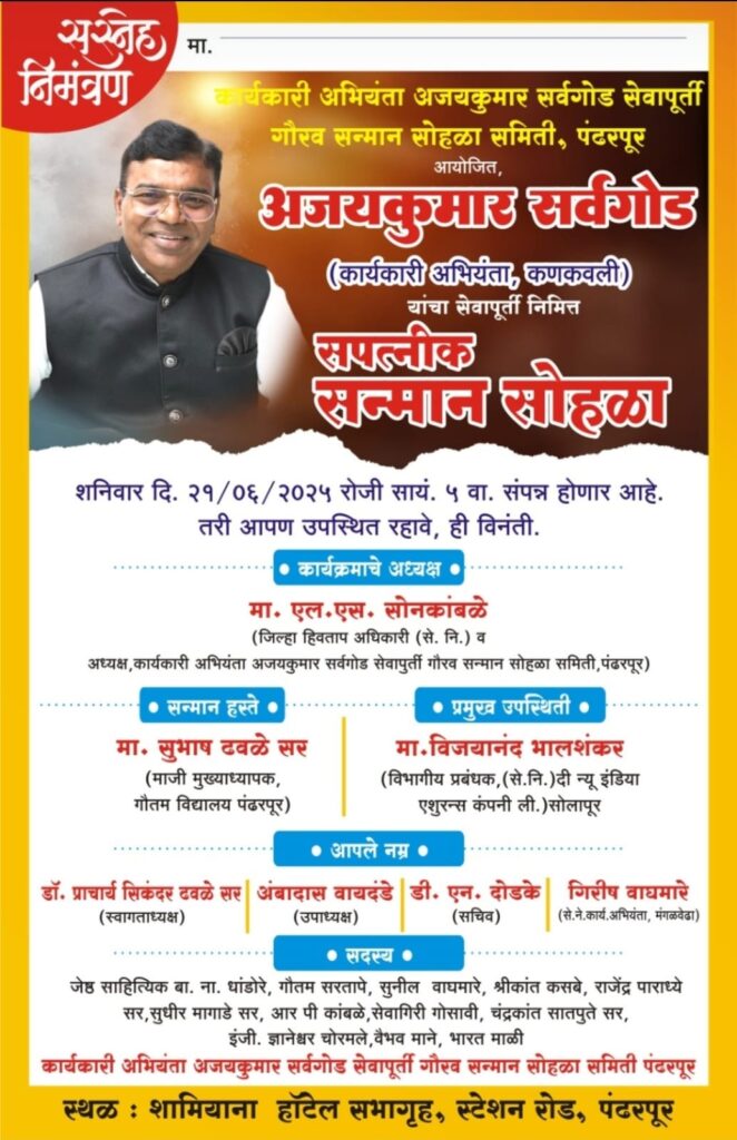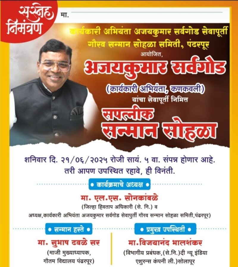 कणकवली (प्रतिनिधी) : सार्वजनिक बांधकाम विभाग मधून कार्यकारी अभियंता पदावरून सेवानिवृत्त झालेले अजयकुमार सर्वगोड यांचा सपत्नीक भव्य नागरी सत्कार 21 जून रोजी सायंकाळी 5 वाजता शामियाना हॉटेल सभागृह स्टेशन रोड पंढरपूर येथे आयोजित करण्यात आला आहे. सार्वजनिक बांधकाम विभाग कणकवली च्या कार्यकारी अभियंता पदावरून सर्वगोड 31 मार्च 2025 रोजी सेवानिवृत्त झाले. सर्वगोड यांचे मूळ गाव हे पंढरपूर आहे. आपल्या भूमीतील सुपुत्राने तळकोकण प्रांतात जाऊन आपल्या कार्यकर्तृत्वाचा डंका पिटला आहे. कणकवली विभागाचा कार्यकारी अभियंता पदाचा कार्यभार सांभाळताना सर्वगोड यांनी स्वच्छ आणि पारदर्शक कारभार केला. अभ्यागतानी भेटण्यासाठी परवानगी घेण्याची गरज नाही अशी पाटी आपल्या केबिन च्या दरवाजावर लावून केबिनचा दरवाजा उघडा ठेवून सर्वगोड यांनी कार्यकारी अभियंता पदाचा कार्यभार पारदर्शक ठेवला. पिडब्ल्यूडी च्या कणकवली विभागात 2 हजार हुन अधिक कोटींच्या विकासकामांचा त्यांनी धडाका लावला. साहित्य, कला , सांस्कृतिक, सामाजिक क्षेत्रातही सर्वगोड कणकवली येथे कार्यरत असताना नेहमीच सक्रिय सहभागी झाले. सर्वगोड यांच्या याच कार्याचा गौरव करण्यासाठी पंढरपूर येथे नागरी समिती गठीत करण्यात आली आहे. कार्यकारी अभियंता अजयकुमार सर्वगोड सेवापूर्ती गौरव सोहळा समिती पंढरपूर यांच्या वतीने सर्वगोड यांचा सपत्नीक भव्य नागरी सत्कार शामियाना हॉटेल सभागृह स्टेशन रोड पंढरपूर येथे आयोजित करण्यात आला आहे. गौरव समितीचे अध्यक्ष एल एस सोनकांबळे यांच्या अध्यक्षतेखाली संपन्न होणाऱ्या हा सत्कार सोहळा गौतम विद्यालय पंढरपूर चे माजी मुख्याध्यापक सुभाष ढवळे, न्यू इंडिया इन्शुरन्स कंपनीचे सोलापूर विभागीय अध्यक्ष विजयानंद भालशंकर यांच्या हस्ते संपन्न होणार आहे. या सत्कार सोहळ्यास उपस्थित राहण्याचे आवाहन प्राचार्य डॉ सिकंदर ढवळे, अंबादास वायदंडे,डी. एन.दोडके, गिरीष वाघमारे तसेच गौरव समितीच्या सर्व सदस्यांनी केले आहे.