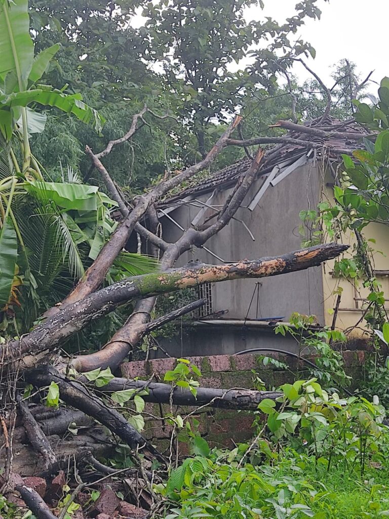 अंजली खाडे या एकट्याच वयोवृद्ध महिला आपल्या कोकाटेवाडी येथील घरात राहतात. त्यांच्या पतीचे काही वर्षांपूर्वी निधन झाले आहे. तर मुली विवाहित आहेत. शुक्रवारी सायंकाळी साडेपाच वाजण्याच्या सुमारास त्या शेजाऱ्यांकडे गेल्या होत्या याच दरम्यान घरात शेजारी असलेले जुनाट झाड अचानक घरावर कोसळले. यामुळे घराच्या छपराचे मोठे नुकसान झाले आहे.सुदैवाने यावेळी त्या शेजाऱ्यांकडे गेल्या होत्या त्यामुळे सुदैवाने त्या या वर्गातून वाचल्या.त्यातच पाऊस पडत असल्यामुळे घरातील सामानाचे सुद्धा नुकसान झाले आहे. ऐन पावसाळ्यात घराचे छप्पर कोसळल्यामुळे या वयोवृद्ध महिलेच्या निवाऱ्याचा प्रश्न निर्माण झाला आहे. गेल्यावर्षी पावसाळ्यात सुद्धा झाडाची फांदी पडून नुकसान झाले होते. घराच्या नुकसानीची पाहणी व पंचनामा तलाठी कडुलकर यांनी केला आहे. या वृद्ध महिलेला शासनाकडून ताबडतोब नुकसान भरपाई मिळावी. अशी मागणी केली जात आहे.