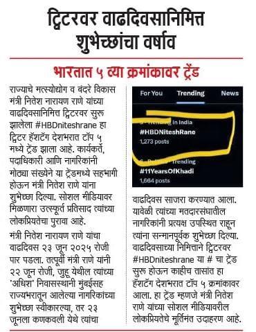 ब्युरो न्यूज (प्रतिनिधी) : राज्याचे मत्स्योद्योग व बंदरे विकास मंत्री नितेश नारायण राणे यांच्या वाढदिवसानिमित्त द्विटरवर सुरू झालेला #HBDniteshrane हा द्विटर हॅशटॅग देशभरात टॉप ५ मध्ये ट्रेंड झाला आहे. कार्यकर्ते, पदाधिकारी आणि नागरिकांनी मोठ्या संख्येने या ट्रेंडमध्ये सहभागी होऊन मंत्री नितेश राणे यांना शुभेच्छा दिल्या. सोशल मीडियावर मिळणारा उत्स्फूर्त प्रतिसाद त्यांच्या लोकप्रियतेचा पुरावा आहे. मंत्री नितेश नारायण राणे यांचा वाढदिवस २३ जून २०२५ रोजी पार पडला. तत्पूर्वी मंत्री राणे यांनी २२ जून रोजी, जुहू येथील त्यांच्या ‘अधिश’ निवासस्थानी मुंबईसह राज्यभरातून आलेल्या नागरिकांच्या शुभेच्छा स्वीकारल्या, तर २३ जूनला कणकवली येथे त्यांचा वाढदिवस साजरा करण्यात आला. यावेळी त्यांच्या मतदारसंघातील नागरिकांनी प्रत्यक्ष उपस्थित राहून त्यांना सन्मानपूर्वक शुभेच्छा दिल्या. वाढदिवसाच्या निमित्ताने द्विटरवर #HBDniteshrane या # चा ट्रेंड सुरू होऊन काहीच तासांत हा हॅशटॅग देशभरात टॉप ५ क्रमांकावर आला. हा ट्रेंड म्हणजे मंत्री नितेश राणे यांच्या सोशल मीडियावरील लोकप्रियतेचे मूर्तिमंत उदाहरण आहे.