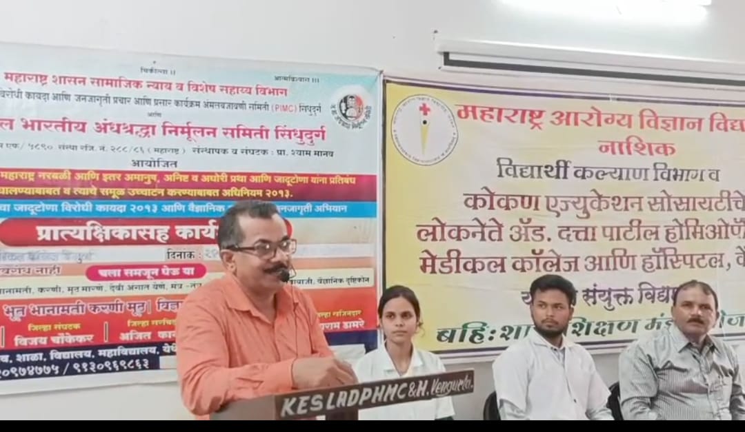 कोकण एज्युकेशन सोसायटीच्या लोकनेते ऍड. दत्ता पाटील होमिओपॅथिक मेडिकल कॉलेजमध्ये आयोजित केलेल्या महाविद्यालय व महाराष्ट्र आरोग्य विज्ञान विद्यापीठ, विद्यार्थी कल्याण विभाग, बहि:शाल शिक्षण मंडळ कार्यक्रमात केले. यावेळी त्यांच्या समवेत विचारमंचावर कॉलेजचे प्राचार्य डॉ. के. जी. केळकर, उपप्राचार्य मनोज आरोस्कर, अभाअंनिस समितीचे उपाध्यक्ष व बहि:शाल शिक्षण मंडळाचे सचिव डॉ. संजिव लिंगवत, अभाअंनिसचे सदस्य चंद्रकांत म्हापणकर आदी उपस्थित होते .