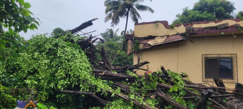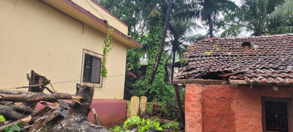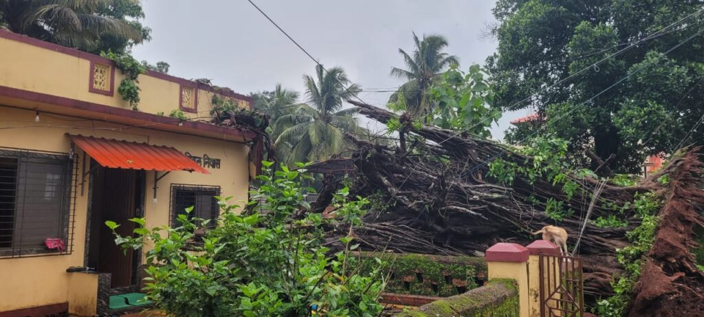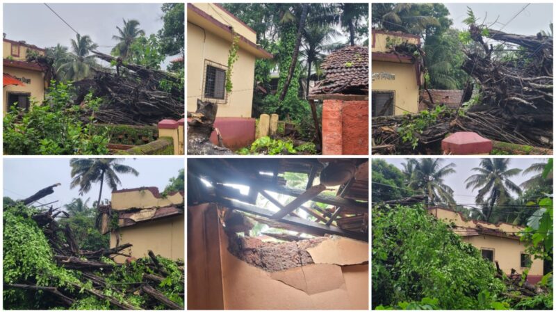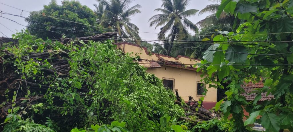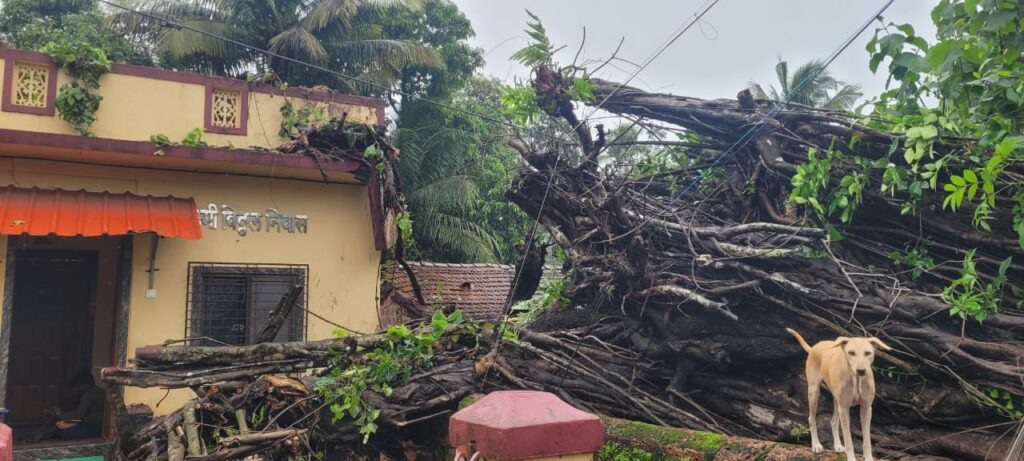 चौके (प्रतिनिधी) : गेले दोन दिवस सुरू असलेल्या मुसळधार पावसाने चौके थळकरवाडी येथे वस्ती लगत असलेला महाकाय वटवृक्ष गुरुवारी सकाळी कोसळल्याने लगतच्या दोन घरांच्या मध्ये पडल्याने दोन्ही घरांचे मोठे नुकसान झाले असून अंदाजे नुकसानीचा आकडा लाखोच्या घरात आहे. चौके थळकरवाडीच्या मध्यभागी असलेल्या या प्राचीन महाकाय वटवृक्षाला येथील जवळपास असलेले ग्रामस्थ दैवत मानून पूजा करत असत वटपौर्णिमेला वाडीतील महिला याच वटवृक्षाची मनोभावे पूजा करत असत गतवर्षी वटवृक्ष जीर्ण झाल्याने सुकलेल्या फांद्या पडत असल्याने येथील ग्रामस्थांकडून तोडून घेण्यात आल्या होत्या. गेले दोन दिवस सतत पडणाऱ्या पावसाने आज पहाटे वटवृक्ष उन्मळून पडला. लगतच्या वंदना बाळकृष्ण गावडे व प्राची प्रशांत कुबल यांच्या दोन्ही घरांच्या मधोमध पडल्याने मोठी जीवितहानी टळली मात्र दोन्ही घरांचे मोठ्या प्रमाणावर नुकसान झाले आहे. घटनेची माहिती मिळतात चौके सरपंच पि. के. चौकेकर यांनी घटनास्थळी भेट देत पाहणी करत चौके तलाठी पोलीस पाटील यांना घटनेची कल्पना दिली. चौके तलाठी पी. जी. गुरव, चौके ग्राम अधिकारी लक्ष्मण सरमळकर यांनी घटनास्थळी येत पंचनामा केला. अंदाजे लाख रुपये नुकसान झाले असल्याने दोन्ही घरमालकांना लवकरात लवकर नुकसान भरपाई मिळावी अशी ग्रामस्थांकडून मागणी होत आहे.