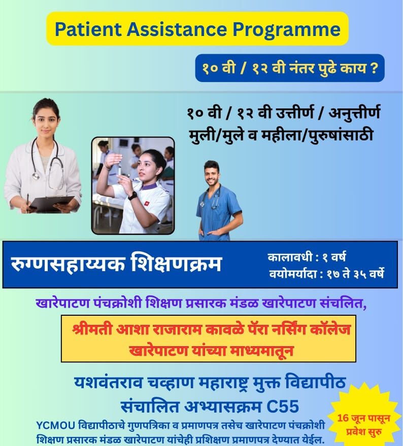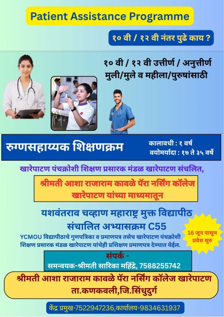 खारेपाटण (प्रतिनिधी) : पंचक्रोशी शिक्षण प्रसारक मंडळ, खारेपाटणच्या माध्यमातून ग्रामीण भागातील विद्यार्थ्यांसाठी नर्सिंग क्षेत्रामधील करिअरची एक उत्तम संधी उपलब्ध करून देण्याच्या उद्देशाने चालू शैक्षणिक वर्षापासून यशवंतराव चव्हाण महाराष्ट्र मुक्त विद्यापीठ मान्यताप्राप्त आशा राजाराम कावळे पॅरानर्सिंग कॉलेज खारेपाटण येथे प्रथमच सुरू करण्यात येत असून याचा फायदा दशक्रोशीतील विद्यार्थ्यांनी घ्यावा असे आवाहन खारेपाटण पंचक्रोशी शिक्षण प्रसारक मंडळाचे अध्यक्ष प्रवीण लोकरे यांनी प्रसिध्दी पत्रकाद्वारे केले आहे. या प्रशिक्षण कोर्स द्वारे रुग्णसहाय्यक शिक्षण अभ्यासक्रमाचा समावेश करण्यात आला असून यामध्ये करिअरच्या अनेक संधी उपलब्ध आहेत. या अभ्यासक्रमातून सरकारी किंवा खासगी रुग्णालयात, वृद्धाश्रमात, शाळांमध्ये किंवा इतर आरोग्य सेवा संस्थांमध्ये विद्यार्थ्यांना करिअरची उत्तम संधी उपलब्ध होत आहे. रुग्णसहाय्यक शिक्षणक्रमामध्ये चांगले उत्पन्न मिळवण्याची संधी विद्यार्थ्यांना याद्वारे उपलब्ध करून दिली जाते. तर या अभ्यासक्रमासाठी इयत्ता दहावी पास अथवा नापास विद्यार्थी,सिनिअर कॉलेजमध्ये शिकत असलेले विद्यार्थी तसेच रुग्णालयात काम करणारे अकुशल कर्मचारी,रुग्णालयात आधीपासून काम करणारे इ.१०वी पास अथवा नापास कर्मचारी यांना प्रवेश घेता येईल. ग्रामीण भागातील विद्यार्थ्यांना करिअरच्या उत्तम संधी निर्माण करून देण्याच्या उद्देशाने चालू शैक्षणिक वर्षापासून या अभ्यासक्रमाची सुरुवात खारेपाटण कॉलेज येथे करण्यात येत आहे. या अभ्यासक्रमासाठी प्रवेश प्रक्रिया खारेपाटण कॉलेजमध्ये सुरू करण्यात आलेली आहे. जास्तीत जास्त विद्यार्थ्यांनी या संधीचा फायदा घ्यावा असे आवाहन खारेपाटण प्रशालेच्या वतीने करण्यात आले आहे.