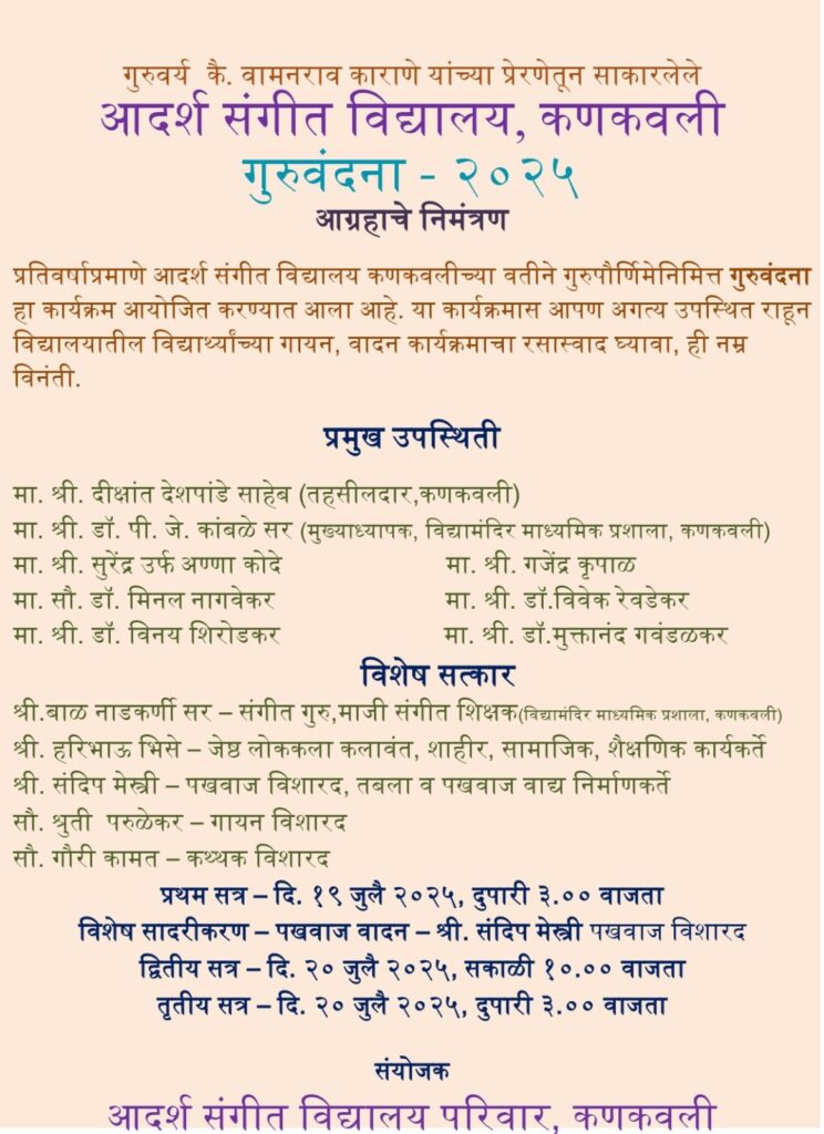 या कार्यक्रमाला प्रमुख पाहुणे म्हणून कणकवली तहसीलदार दीक्षांत देशपांडे, विद्यामंदिर हायस्कूलचे मुख्याध्यापक डॉ. पी. जी. कांबळे, आण्णा कोदे, डॉ. मीनल नागवेकर, डॉ. विनय शिरोडकर, राजेंद्र कृपाळ, डॉ. विवेक रेवडेकर, डॉ. मुक्तानंद गवंडळकर आदी मान्यवर उपस्थित राहणार आहेत. तर या कार्यक्रमाचे प्रथम सत्र दी. १९ जुलै २०२५ रोजी दु.३.०० वा. सुरू होणार असून पखवाज विशारद संदीप मेस्त्री यांचे पखवाज वादनाचे विशेष सादरीकरण होणार आहे. तसेच द्वितीय सत्र दी. २० जुलै २०२५ रोजी स. १०.०० वा. आणि तृतीय सत्र दु.३.०० वा. सुरू होणार आहे. या कार्यक्रमात संगीत गुरू माजी शिक्षक बाळ नाडकर्णी, ज्येष्ठ लोककलावंत सामाजिक कार्यकर्ते प्रा. हरिभाऊ भिसे, पखवाज विशारद संदीप मेस्त्री, गायन विशारद श्रुती परुळेकर व कथक विशारद गौरी कामात यांचा विशेष सत्कार आदर्श संगीत विद्यालय कणकवलीच्या वतीने करण्यात येणार आहे. तरी या कार्यक्रमाला नागरिकांनी जास्तीत जास्त संख्येने उपस्थित राहावे व कार्यक्रमाचा आस्वाद घ्यावा असे आवाहन आदर्श संगीत विद्यालय कणकवलीच्या वतीने सर्वांना करण्यात आले आहे.