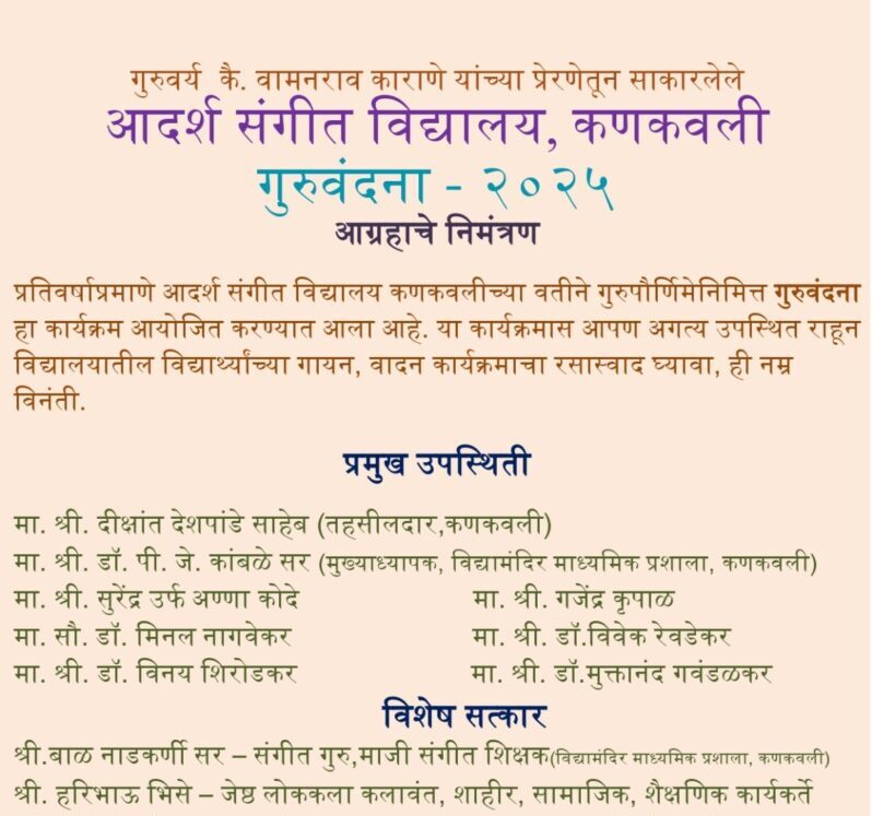 खारेपाटण (प्रतिनिधी) : गुरुवर्य कै. वामनराव काराणे यांच्या प्रेरणेतून साकारलेले आदर्श संगीत विद्यालय कणकवली यांच्या वतीने गुरुपौर्णिमे निमित्त गुरुवंदना – २०२५ कार्यक्रमाचे आयोजन कणकवली येथे करण्यात आले असून दी.१९ व २० जुलै २०२५ असा सलग दोन दिवस हा कार्यक्रम चालणार असल्याची माहिती संगीत विद्यालयाचे प्रशिक्षक संदीप पेंडूरकर यांनी प्रसिद्धीपत्रकाद्वारे दिली.
