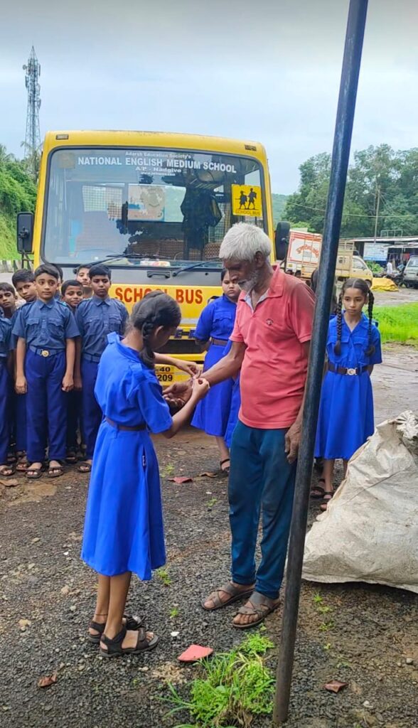 कणकवली (प्रतिनिधी) : कणकवली तालुक्यातील आदर्श एज्युकेशन सोसायटी संचलित नॅशनल इंग्लिश मिडीयम स्कुल शालेय शिक्षणाबरोबरच सामाजिक बांधिलकीचे शिक्षण नेहमीच देत असते. याचाच एक भाग म्हणून श्रावण पौर्णिमा अर्थात रक्षाबंधन दिनाचे औचित्य साधून समाजासाठी काम करणाऱ्या समाज बांधवांचा राखी बांधून अनोख्या पद्धतीने सन्मान करण्याचा उपक्रम राबविण्यात आला.