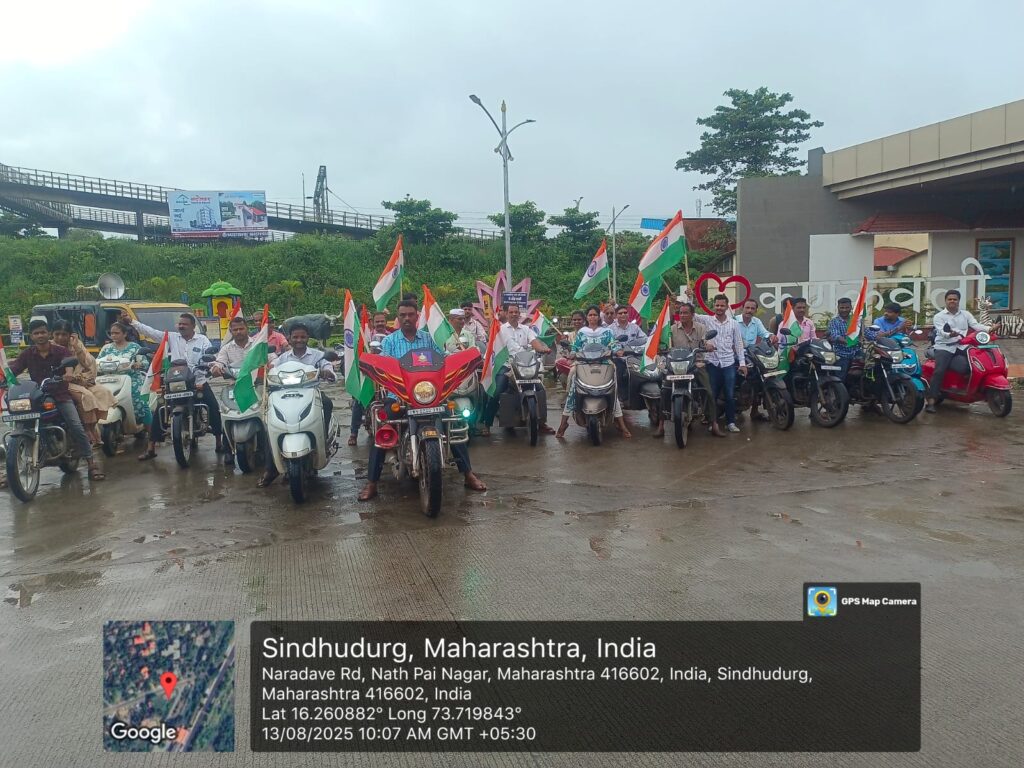 कणकवली (प्रतिनिधी) : हर घर तिरंगा घर घर तिरंगा या अभियानांतर्गत कणकवली नगर पंचायत कडून मुख्याधिकारी गौरी पाटील यांच्या मार्गदर्शनाखाली शहरात तिरंगा बाईक रॅलीचे आयोजन करण्यात आले होते. यावेळी नगरपंचायत कार्यालय कडून तिरंगा बाईक रॅली सुरवात होऊन पटकी देवी मंदिर, बाजारपेठ मार्गे कणकवली रेल्वे स्टेशनं व तेथून पुन्हा कणकवली नगरपंचायत अशी रॅली काढण्यात आली. यावेळी नगरपंचायत कर्मचाऱ्यांच्या वतीने 15 ऑगस्ट स्वातंत्र्य दिनाच्या निमित्ताने वातावरण निर्मिती व जनजागृती करण्यात आली.