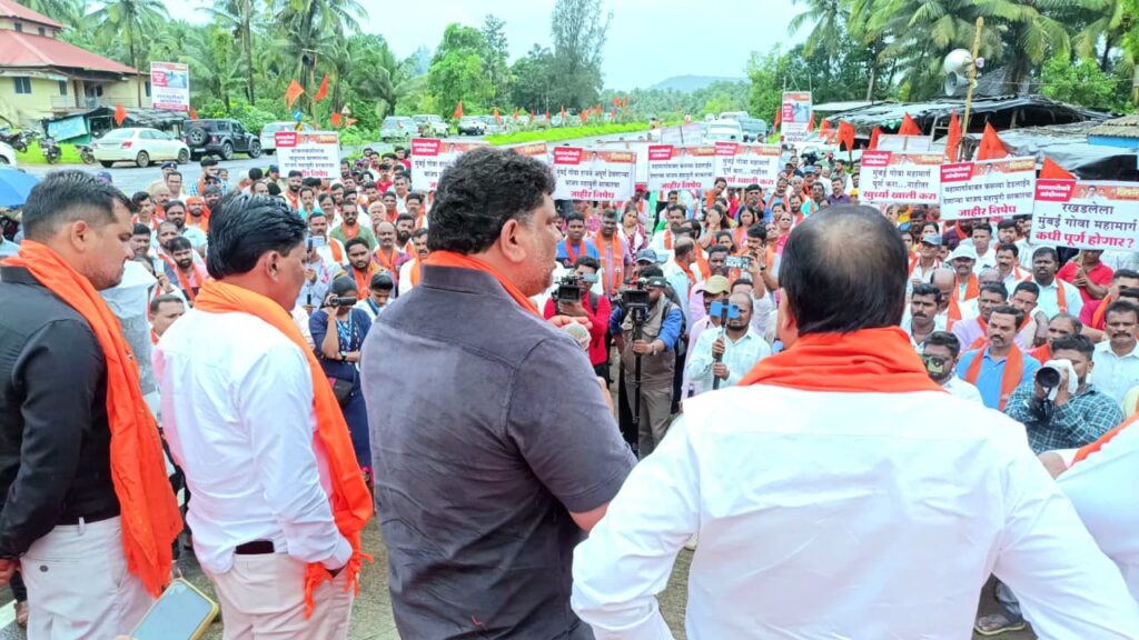 मुंबई गोवा महामार्गाची चाळण झाली आहे. पनवेल पासून ते बांद्यापर्यंत सर्वच ठिकाणी खड्डे पडले आहेत.गेल्या वर्षीच्या गणेशोत्सवापूर्वी हा महामार्ग पूर्ण करणार असे भाजप महायुती सरकारने आश्वासन दिले होते. मात्र यावर्षीचा गणेशोत्सव आला तरी देखील महामार्ग पूर्ण झाला नाही. त्यामुळे सिंधुदुर्ग जिल्हा शिवसेना उद्धव बाळासाहेब ठाकरे पक्षाच्या वतीने हे रास्तारोको आंदोलन छेडण्यात आले.आवाज कुणाचा शिवसेनेचा! या सरकारचे करायचे काय खाली डोके वर पाय! हायवे आमच्या हक्काचा नाही कोणाच्या बापाचा! अशा घोषणा देऊन आंदोलकांनी परिसर दणाणून सोडला. यावेळी उपस्थित जनसमुदायास शिवसेना नेत्यांनी संबोधित केले. दरम्यान राष्ट्रीय महामार्ग (सा.बां.) कार्यकारी अभियंता अनामिका जाधव यांनी आंदोलन स्थळी भेट देऊन वैभव नाईक व शिवसेना नेत्यांशी चर्चा केली.