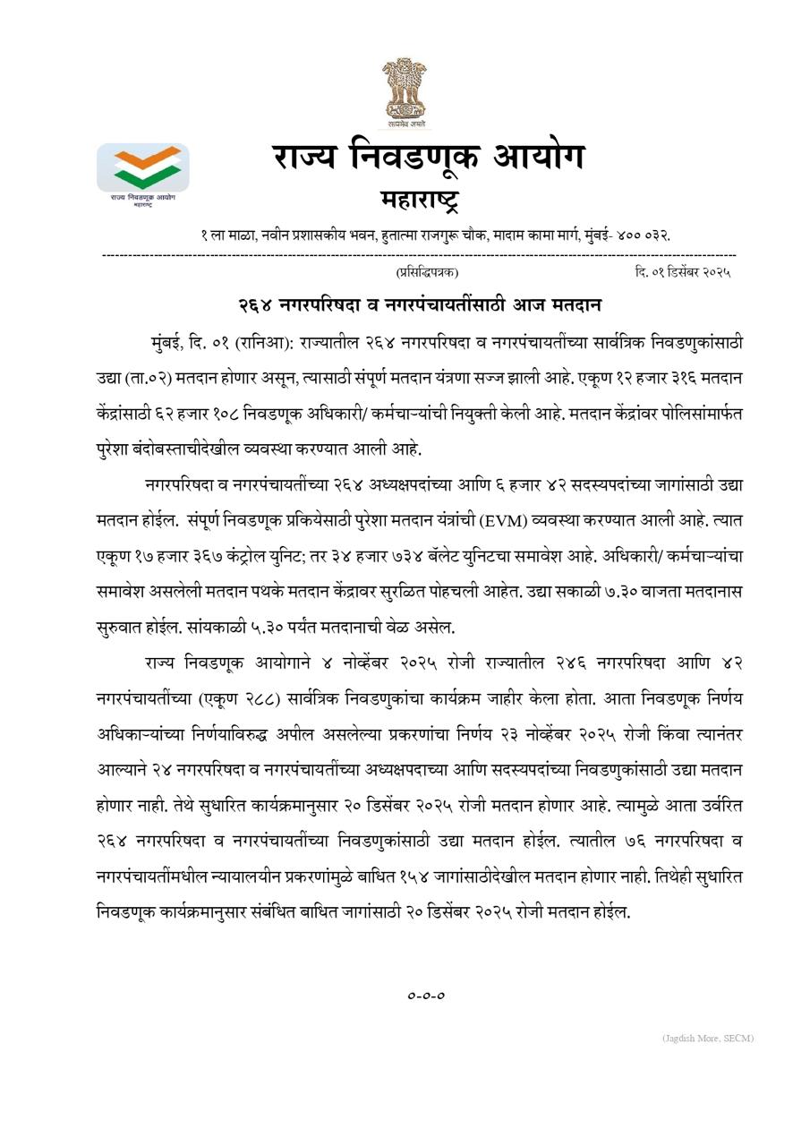 (ब्युरो न्यूज) मुंबई : राज्यातील २६४ नगरपरिषदा व नगरपंचायतींच्या सार्वत्रिक निवडणुकांसाठी उद्या (ता.०२) मतदान होणार असून, त्यासाठी संपूर्ण मतदान यंत्रणा सज्ज झाली आहे. एकूण १२ हजार ३१६ मतदान केंद्रांसाठी ६२ हजार १०८ निवडणूक अधिकारी / कर्मचाऱ्यांची नियुक्ती केली आहे. मतदान केंद्रांवर पोलिसांमार्फत पुरेशा बंदोबस्ताचीदेखील व्यवस्था करण्यात आली आहे.