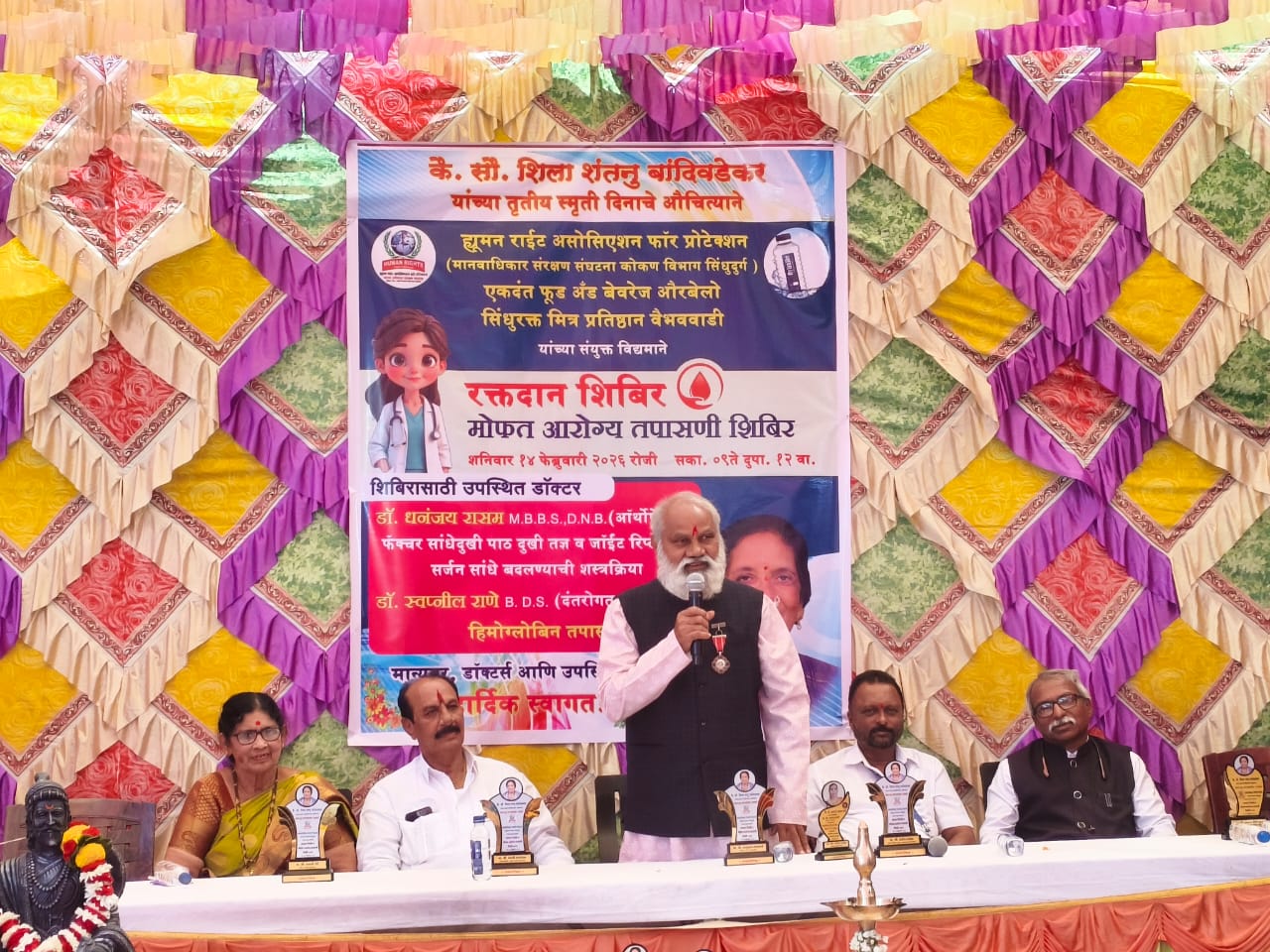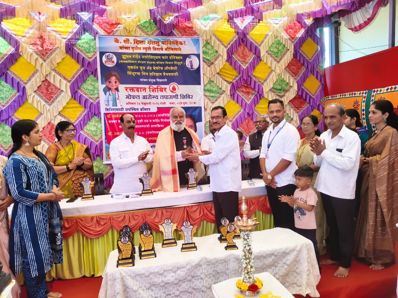 ह्यूमन राईट असोसिएशन फॉर प्रोटेक्शन, एकदंत फूड अँड बेव्हरेजिस, सिंधू रक्तमित्र प्रतिष्ठान वैभववाडी यांच्या संयुक्त विद्यमाने कै. सौ. शिला शंतनु बांदिवडेकर यांच्या तृतीय स्मृती दिनाचे औचित्य साधून रक्तदान शिबिर व मोफत आरोग्य तपासणी शिबिर नुकतेच गडमठ गावठणवाडी येथे आयोजित करण्यात आले होते. या शिबिराचे उद्घाटन पद्मश्री पुरस्कार विजेते परशुराम गंगावणे यांच्या हस्ते फीत कापून तसेच दिपप्रज्वलन करून करण्यात आले. त्याचबरोबर कै. सौ. शिला शंतनु बांदिवडेकर यांच्या प्रतिमेला शंतनु बांदिवडेकर यांच्या हस्ते पुष्पहार अर्पण करण्यात आला.