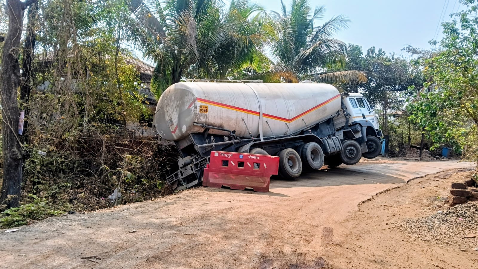 फोंडाघाट (प्रतिनिधी) : बुधवारी पहाटे अडीच वाजता, सिमेंट भरून घाट मार्गे तोंडवली कडे पर्यायी मार्गाने जाणाऱ्या कंटेनर, समोरून येणाऱ्या चार चाकी गाडीला साईड देत असताना, गटाराचे दगड खचल्याने कलंडला. या तीन बाजूला जाणाऱ्या अरुंद रस्त्यामुळे, अवजड वाहनांना वळण घेताना फार त्रास पडत आहे. प्रशासन आणि बांधकाम विभागाच्या नियोजनशून्य वाहतूक व्यवस्थेमुळे या दुर्घटनेतून भविष्यात गंभीर अपघाताची शक्यता वर्तवली जात आहे. आणि त्यास सर्वस्वी बांधकाम विभाग जबाबदार राहील. असा इशारा स्थानिक ग्रामस्थ आणि वाहन चालकांनी दिला आहे. पहाटे अडीच वाजता झालेल्या अपघातानंतर सुमारे दहा ते अकरा तासानंतर निखिल कन्स्ट्रक्शन ने कंटेनर बाजूला केला. त्यामुळे कंपनीच्या बेपरवाई बद्दल संताप व्यक्त होत आहे. त्यामुळे हरकुल मार्ग बंद राहिला.