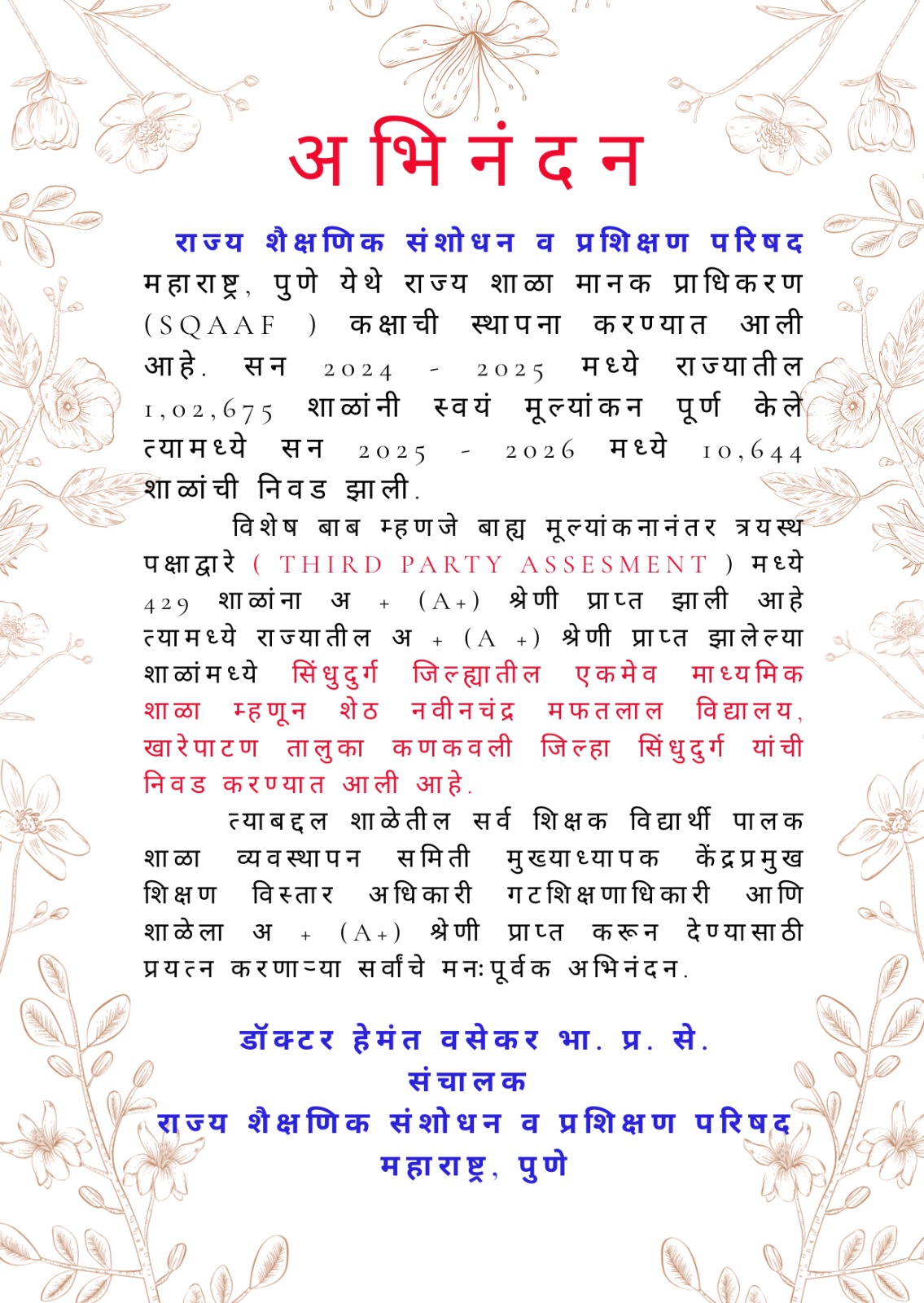 महाराष्ट्र राज्य शैशणिक संशोधन व प्रशिक्षण परिषद पुणे यांच्या वतीने करण्यात आले अभिनंदन