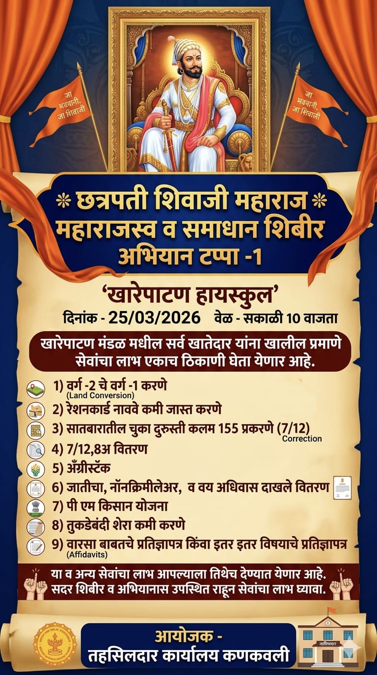 खारेपाटण (प्रतिनिधी) : छत्रपती शिवाजी महाराज महाराजस्व अभियाना अंतर्गत तहसील कार्यालय कणकवली यांच्या महसूल विभागाच्या वतीने दि.२५ मार्च, २०२६ रोजी खारेपाटण हायस्कूल येथे स.१०.०० वा. समाधान शिबिर अभियान टप्पा क्र.१ चे आयोजन करण्यात आले आहे. सदर शिबिराचा जास्तीत जास्त नागरिकांनी लाभ घ्यावा, असे आवाहन कणकवली तहसीलदार दीक्षांत देशपांडे यांनी केले आहे.