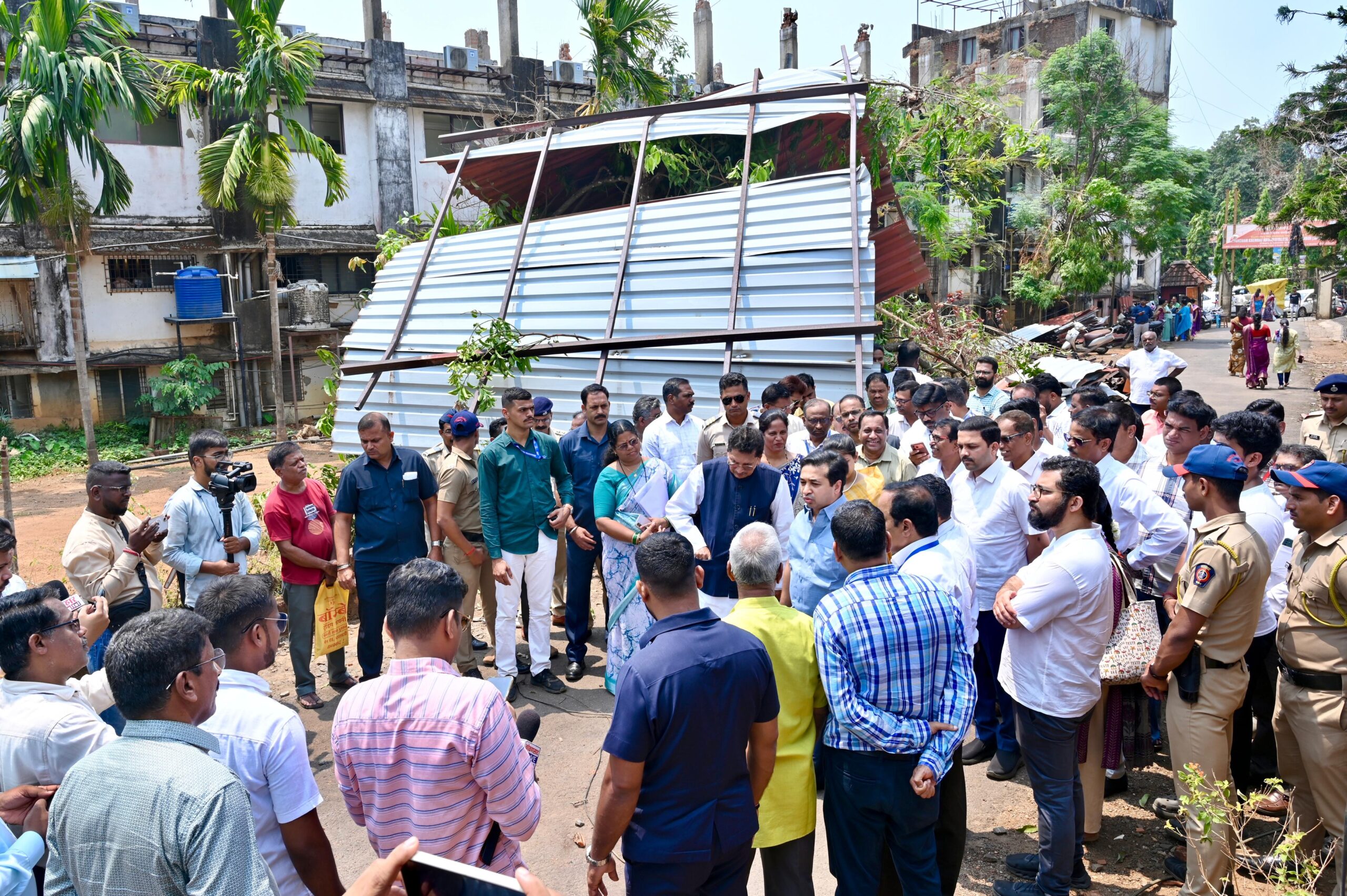 सावंतवाडी (प्रतिनिधी) : चक्रीवादळामुळे गुरुवारी मध्यरात्री सावंतवाडी शहरात झालेल्या नुकसानीची राज्याचे मत्स्य व्यवसाय व बंदरे विकास मंत्री तथा जिल्ह्याचे पालकमंत्री ना. नितेश राणे यांनी शनिवारी सकाळी ११ च्या सुमारास प्रत्यक्ष नुकसानीच्या ठिकाणी भेट देत पाहणी केली. झालेली नुकसानी ही खूपच मोठी असून वेळ पडल्यास निकष बदलून नुकसानग्रस्तांना जास्तीत जास्त मदत मिळवून देणार अशी ग्वाही त्यावेळी पालकमंत्री नितेश राणे यांनी दिली. यावेळी त्यांच्यासोबत स्थानिक आमदार दीपक केसरकर, जिल्हा बँक अध्यक्ष मनीष दळवी, सावंतवाडीच्या नगराध्यक्ष श्रद्धा सावंत भोंसले, उपनगराध्यक्ष अनिल निरवडेकर, लखमराजे भोसले, तहसीलदार श्रीधर पाटील, नगरपरिषदेचे सभापती सुधीर आडीवरेकर, आनंद नेवगी, प्रतीक बांदेकर, मोहिनी मडगावकर, दिपाली भालेकर, माजी नगरसेवक उदय नाईक, दिलीप भालेकर, अर्चित पोकळे, एसपीकेचे प्राचार्य डि. के. भारमल अन्य प्राध्यापक यांसह पदाधिकारी व कार्यकर्ते उपस्थित होते.