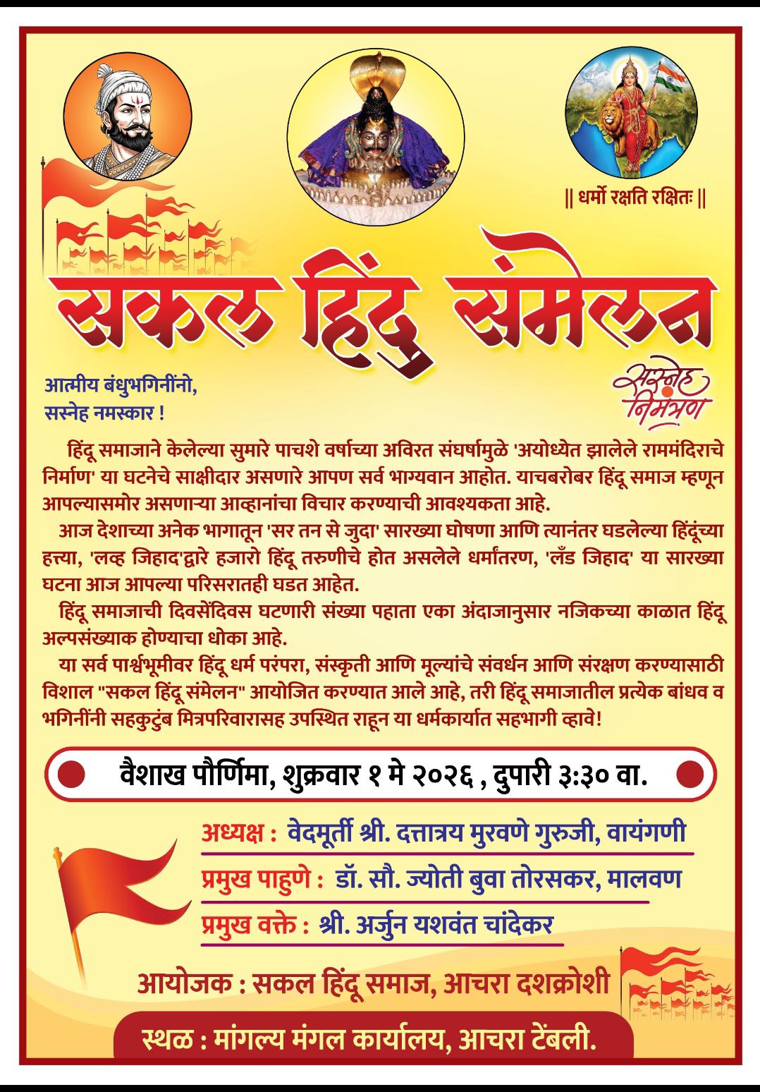 आचरा (प्रतिनिधी) : आचरा दशक्रोशीत हिंदू समाजात ऐक्य निर्माण करण्याच्या उद्देशाने आणि धर्मावरील आघातांचा प्रतिकार करण्यासाठी वैशाख पौर्णिमा शुक्रवार दिनांक १ मे रोजी आचरा टेंबली येथील मांगल्य मंगल कार्यालय येथे दुपारी ३.३० वाजता ‘सकल हिंदू संमेलनाचे’ भव्य आयोजन करण्यात आले आहे. ‘सकल हिंदू समाज, आचरा दशक्रोशी’ यांच्या वतीने हे संमेलन आयोजित करण्यात आले असून, यात बहुसंख्येने सहभागी होण्याचे आवाहन करण्यात आले आहे. सध्याच्या काळात देव, देश आणि धर्माचे रक्षण करण्यासाठी हिंदू समाजाने संघटित होणे ही काळाची गरज बनली आहे. समाजापुढील विविध समस्यांचे निराकरण करणे, समाजावर होणाऱ्या आघातांना चोख प्रत्युत्तर देणे आणि एक बलशाली व समृद्ध समाज घडवणे हे या संमेलनाचे मुख्य उद्दिष्ट आहे. एका सजग हिंदूच्या भूमिकेतून सर्वांनी या कार्यात तन, मन आणि धनाने सहभागी व्हावे, असे विनंती पत्रकात नमूद करण्यात आली आहे.