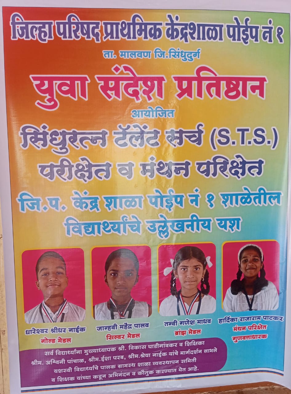 चौके (प्रतिनिधी) : मालवण तालुक्यातील पोईप गावामधील जिल्हा परिषद शाळा केंद्र शाळा पोईप नं. १ मधील विद्यार्थ्यांनी एसटीएस (STS) , बिडीएस (BDS), मंथन, डिसिए (DCA) परिक्षेत भरघोस यश संपादित केले.